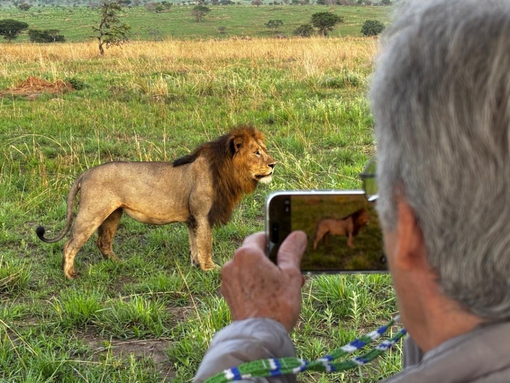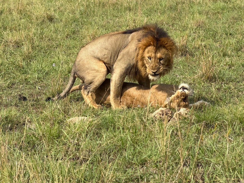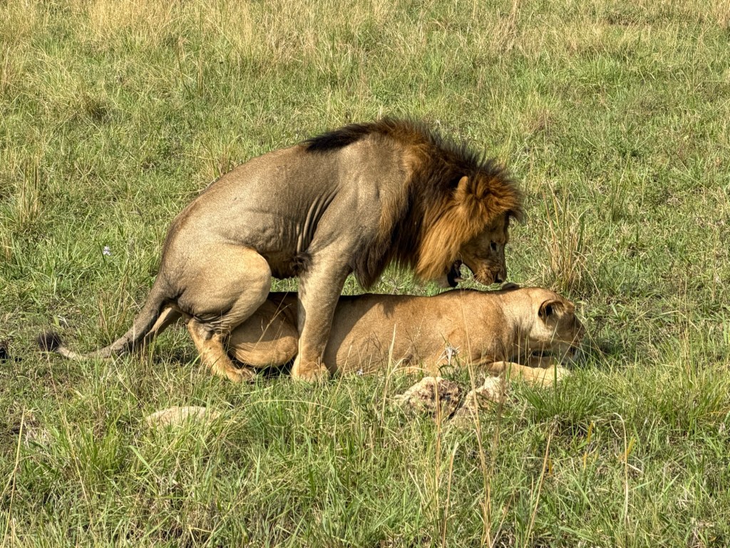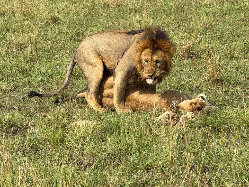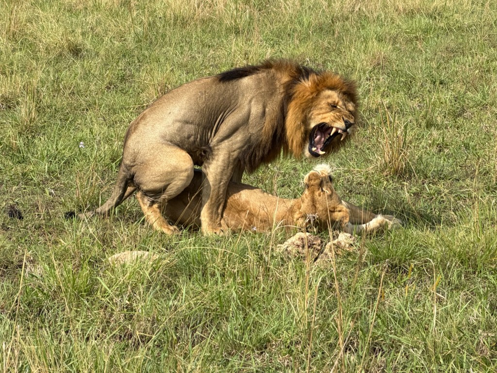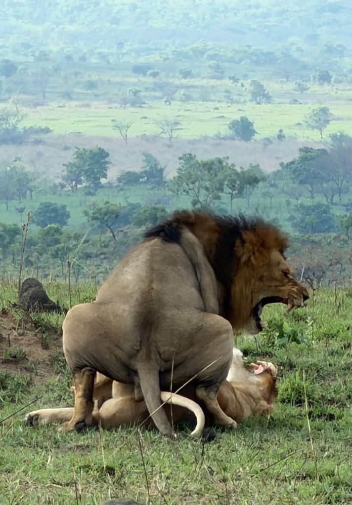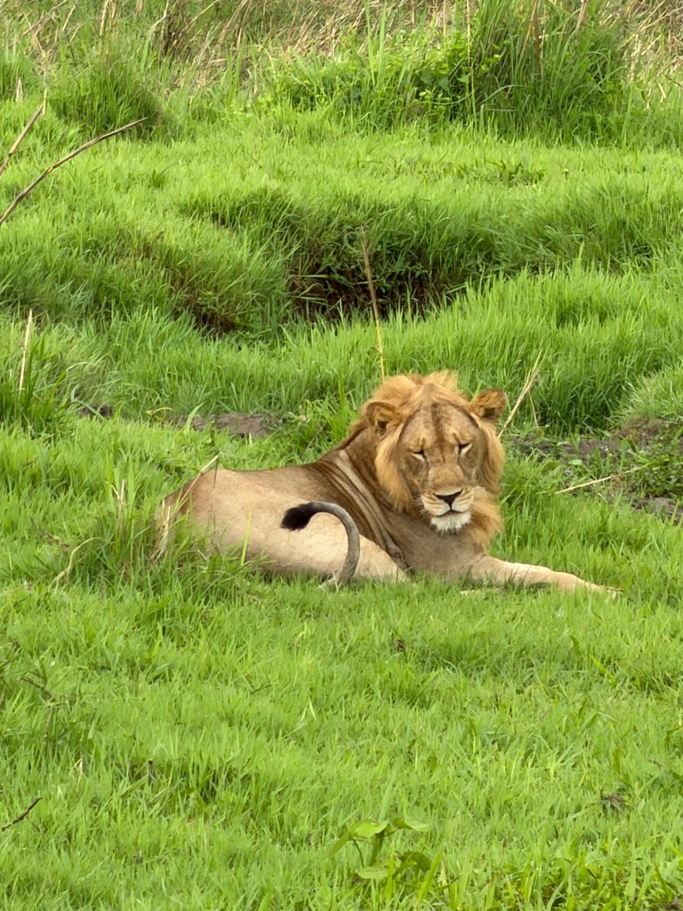 We had better luck finding lions on this drive. First we found a big male with 3 females. We watched them long enough to witness him copulating with the females 2-3 times each. Jonathan believes the girls have been taken over by this male, Nelson, because their previous dominant male, Tony, was killed or pushed out of the pride for lack of strength. Tony had been injured in a poaching snare and not recovered. After 3 weeks go by, a new male will take over, as Nelson is doing. Meanwhile, the two one year olds we had seen earlier waiting for mom, appear to have been abandoned by one of the ladies rather than allow them to be killed by Nelson, who would not permit Tony’s offspring to live.