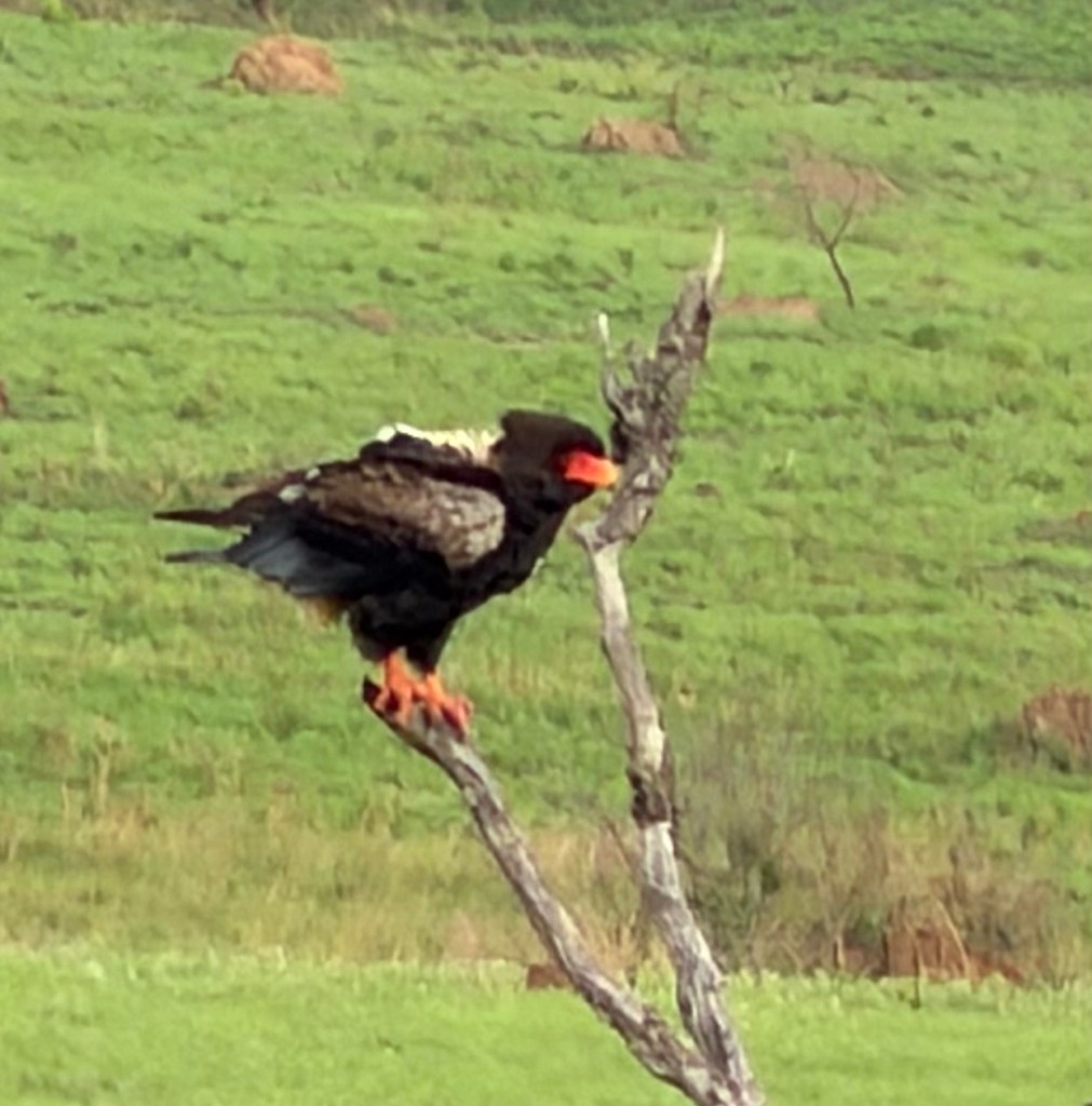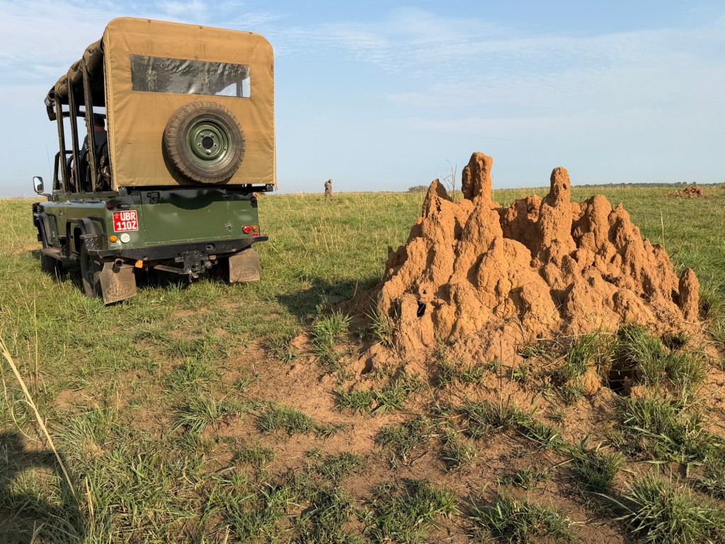Up and out at 5:15 for our first game drive of the trip. No problem getting up early as we were still suffering from jet lag. A quick coffee, into the stadium-seating Land Rover, and off we went to see scenery, animals, birds and termite hills.