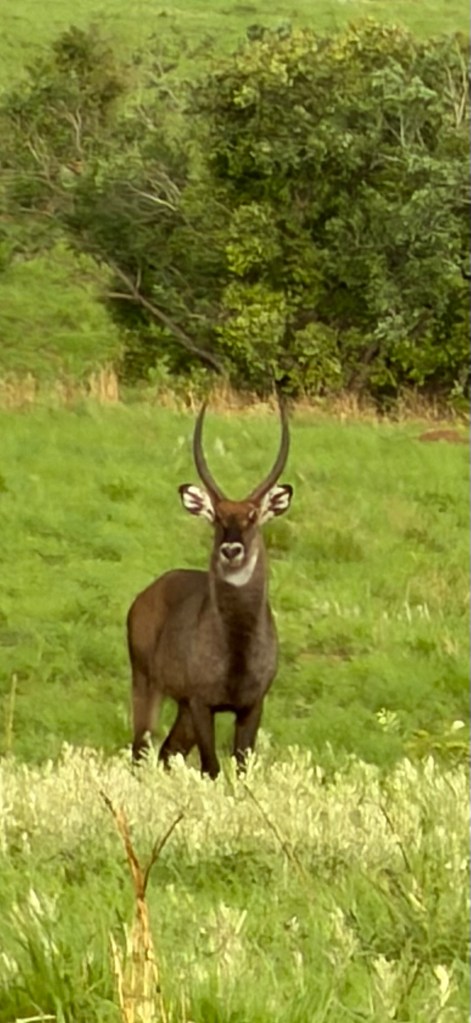 Driving along the dirt roads we saw a few giraffe, oribi, hartebeest, waterbuck and several worthogs. The scenery consisted of gentle rolling hills of forest and Savannah, all very green and pretty and loaded with Kob .