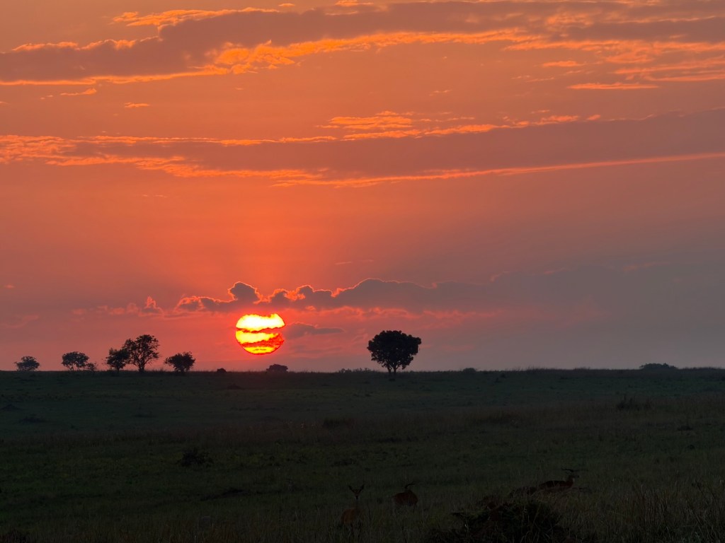 Jonathan joined us with high hopes for spotting lions. It was still dark and cold when we started out. With spotlights scanning the scene, we saw many pair of Kob eyes in the distance and night jars on the road. Gradually the sky lightened and the air warmed. I got a nice sunrise shot. We began to see more animals, especially Kob, but lions eluded us until almost coffee time when we spotted two one year olds.