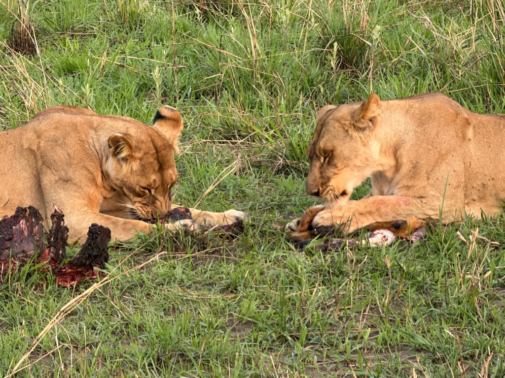 Off again at 5:30 along the same track as other days. Encountered two female lion from the group of six just laying around. Carried on and found Nelson and the three ladies finishing another Kob and making more babies.