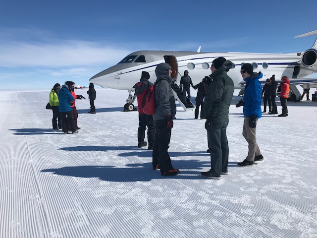 Getting outfitted for Antarctic activities. First up is a walk over a rocky terrain and then on a snowy hillside