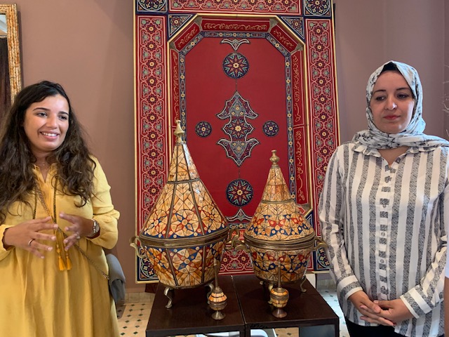 Adventures with JuliaFirst stop in the Center. Women displaying camel bone pots and a leather ceiling art piece. Very fine work.