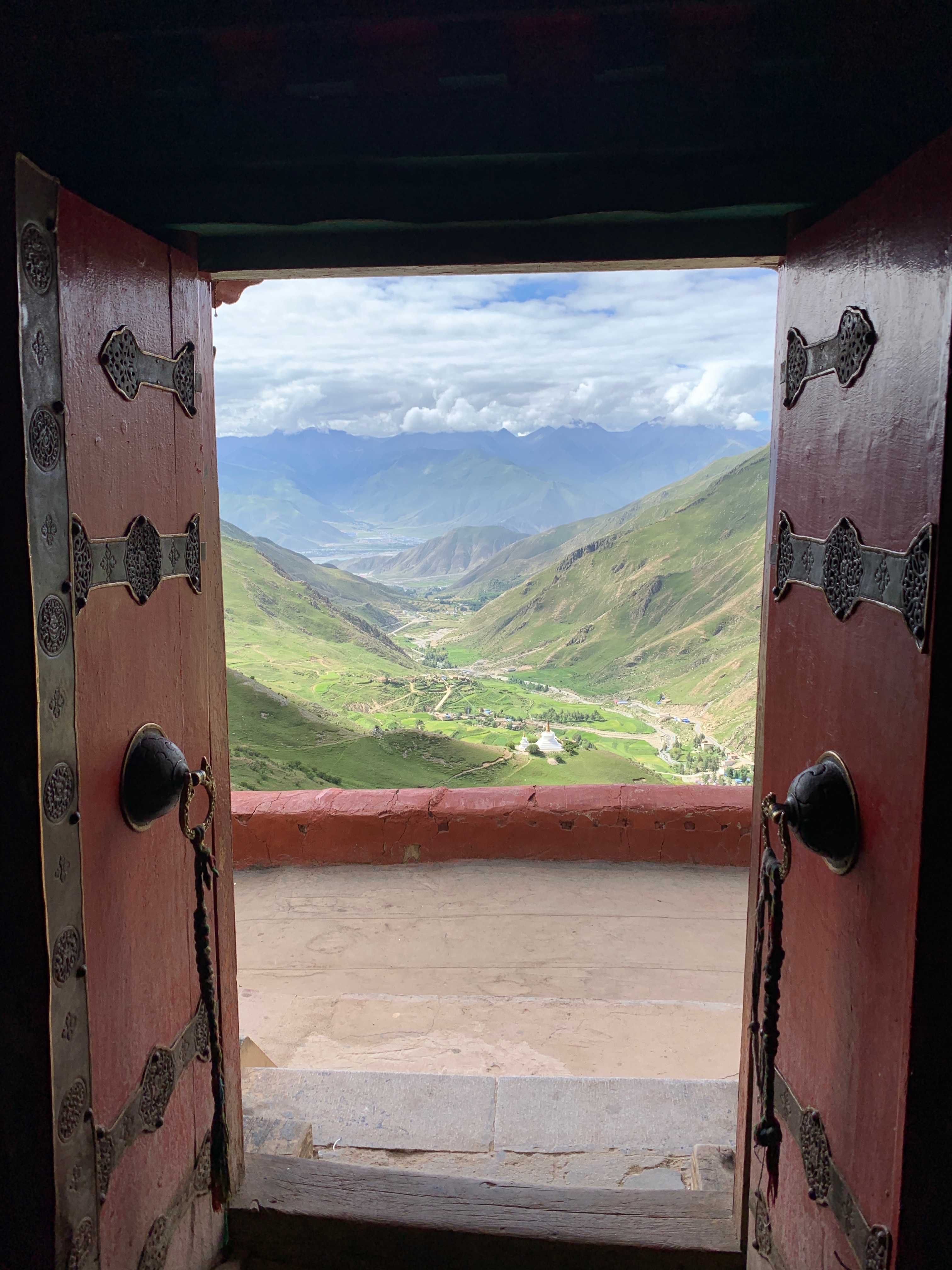 They were sitting near this door with a beautiful view.