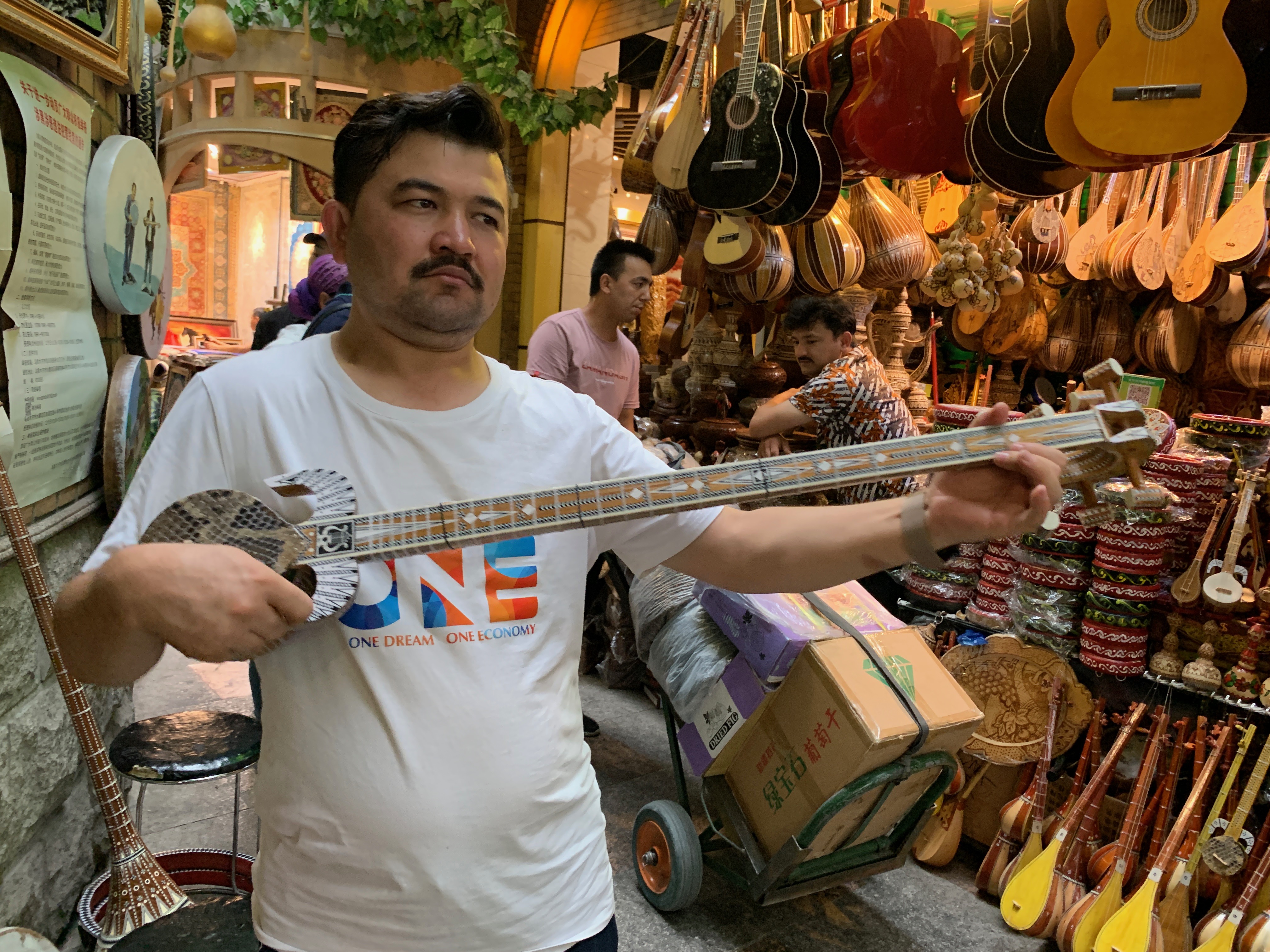 An instrument vendor entertains us with a tune.