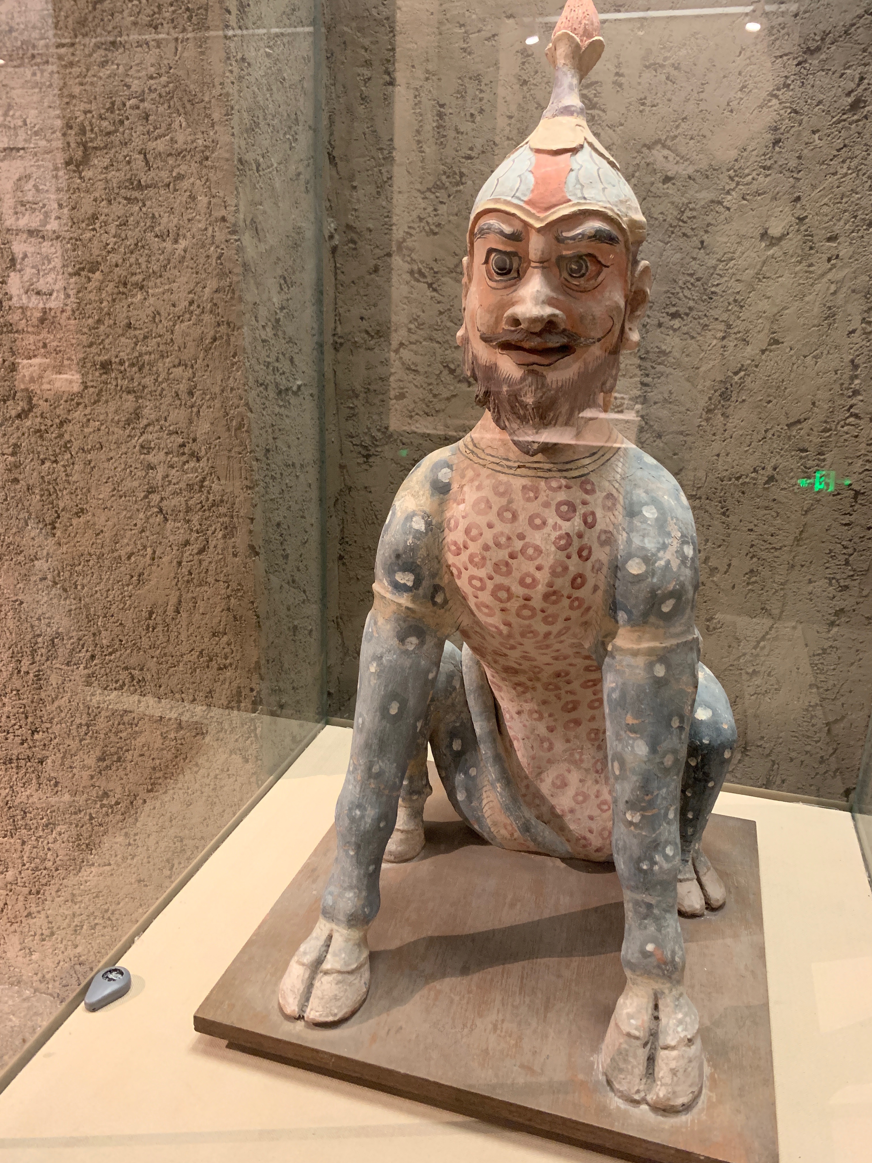 Color-painted statue of a guard best with a man’s head (Tang Dynasty 618-907AD)