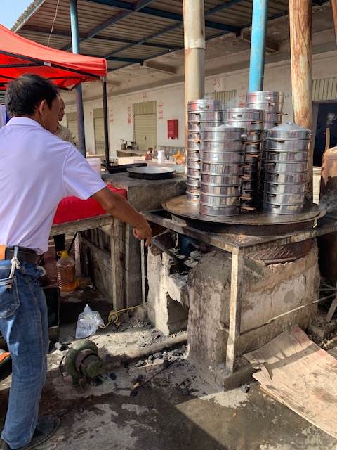 Stoking the fire to keep the steamers hot in the animal market food court.
