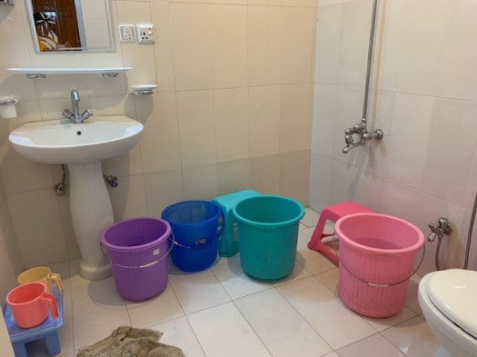 A tub of boiling water, a tub of cold and empty tubs for mixing and ladleing warm water over our heads.