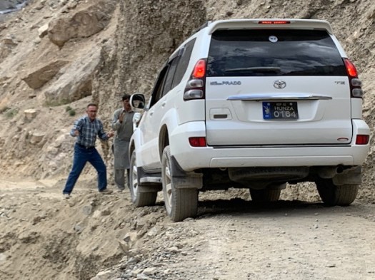 Shifa carefully directs Khajulah over the now very narrow passage with the cliff on one side and the 4 foot ditch on the other.