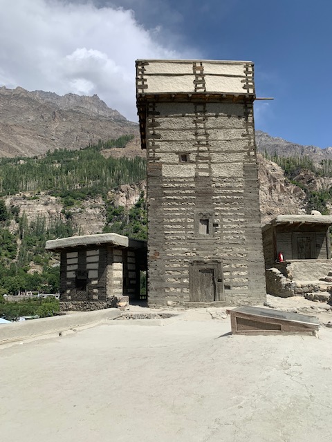 The watch tower at the top of Altit, plus ar small mosque on the right and a store room left and a storage room on the right.