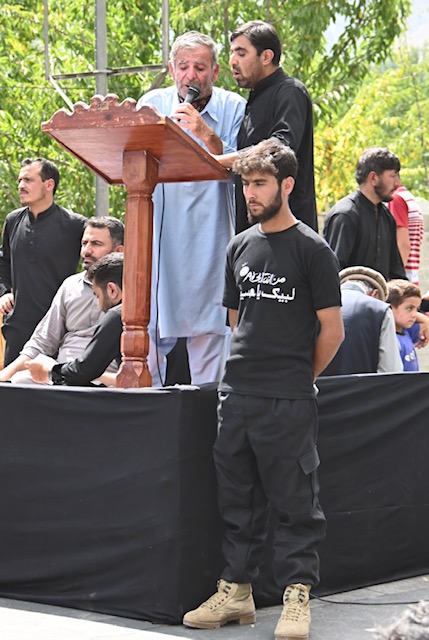 Security watching the crowd as 2 men sing.