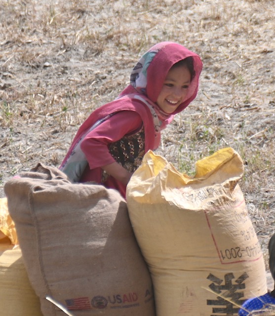 A young girl with freshly threshed wheat.