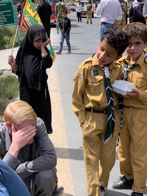 Interesting snap. The boys looking quizzically at the albino man, sheltering his eyes from the direct sun and a Shia girl watching quietly. She was one of very few women at the festival.