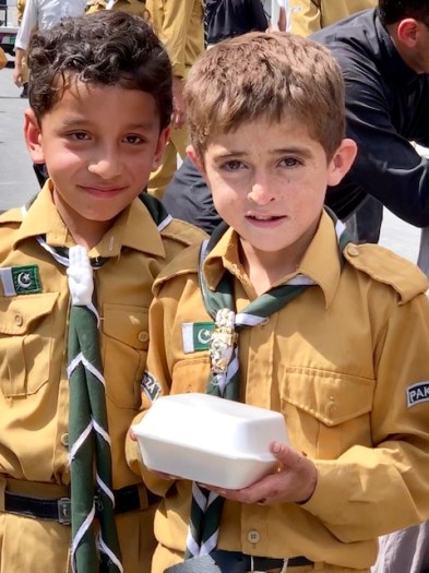 Two cute boys with a lunch container.