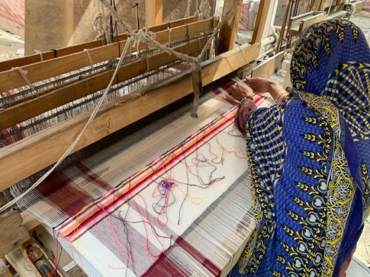 THe other lady was adding a very intricate detail to her weaving. It was very appealing with many different colors.