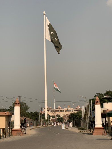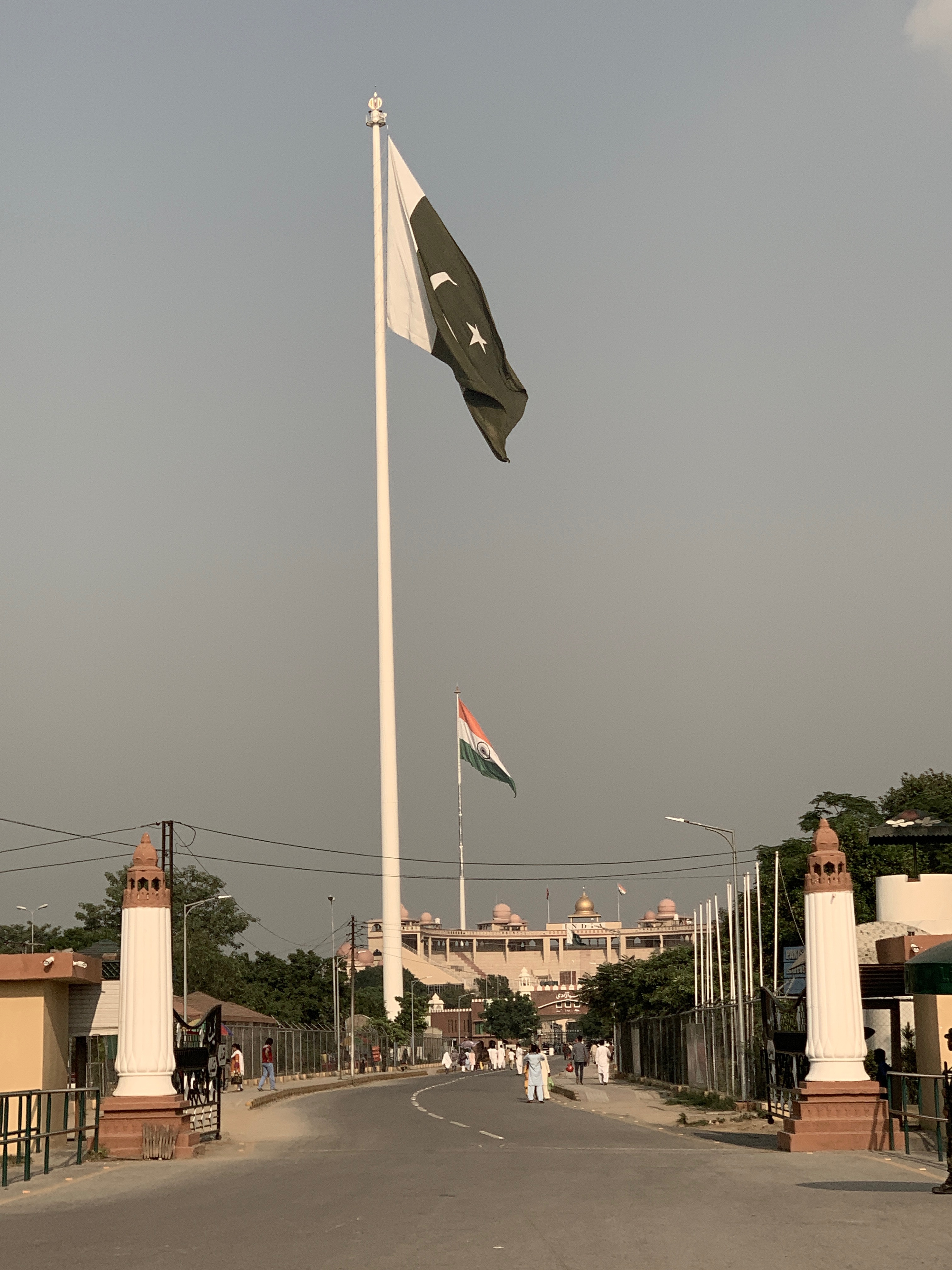 Walking toward the ceremony location. The flags are the same size, but the Indian viewing stands are much larger than the Pakistani side .