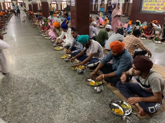 People sitting on the floor eating. There are several halls that each handle a couple hundred at a time.