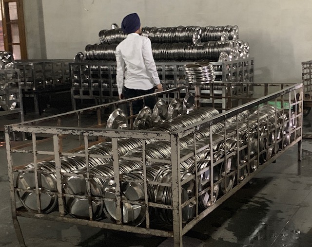 A couple of carts full of cleaned plates. The one in the back must contain several thousand plates.