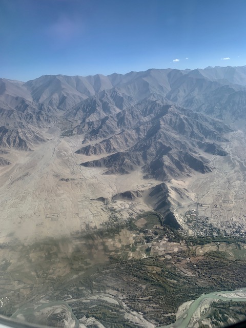 The landscape is still barren 10 minutes out of Leh. There is a village and we can see the Indus River.