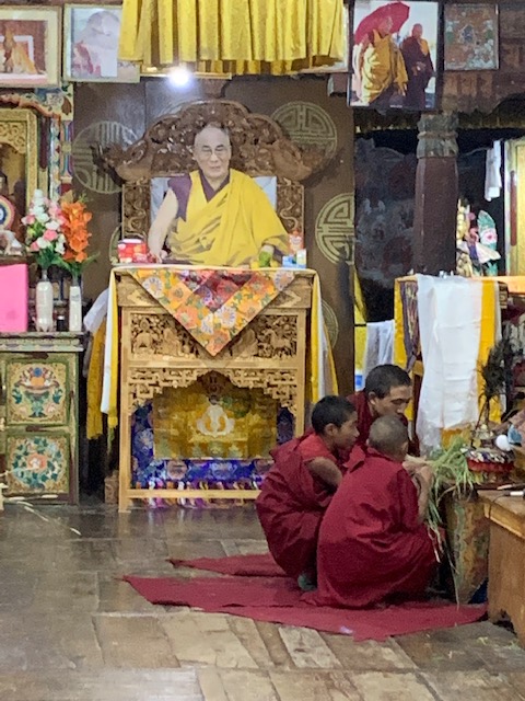 Young monks bowing to the Abbot. The Dali Lama is behind them looking over all.
