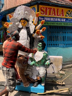 A sculpture is being moved to a vehicle.
