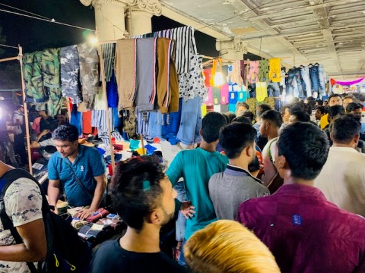 Shoppers are packed into the sidewalk space.