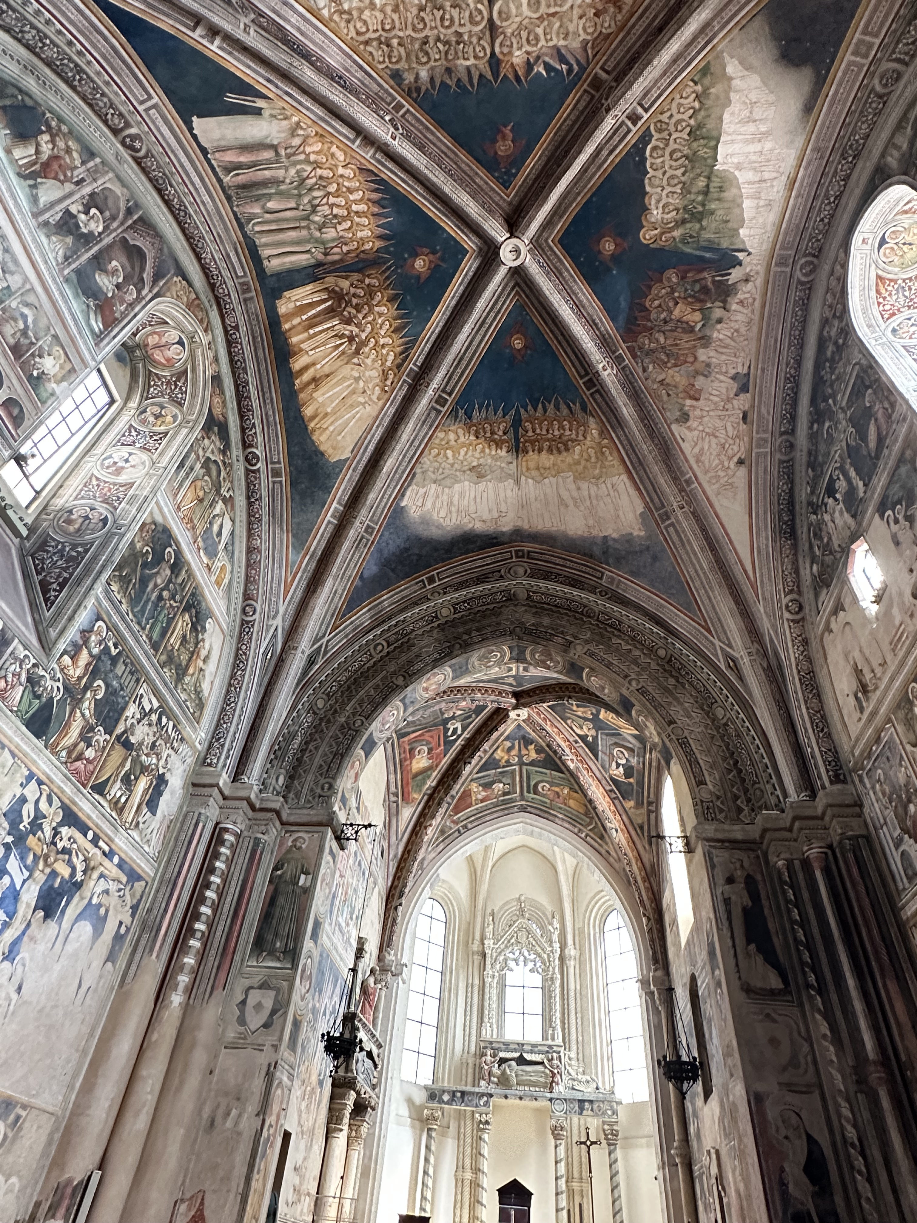 It was commissioned by a man named Romandello. He was the forth son of a local rich lord and not expected to receive any wealth from his father. So he became a crusader knight and a dignitary in the court of Naples. He married up to the countess of Lecce. Supposedly he bit off the finger of the dead St Catherine in Naples and brought it home to create a pilgrimage destination of the Church of St Catherine. He died six years after marrying the countess. She then married her husband’s enemy, the king of Naples. After 8 years, he died in battle. She returned from Naples and commissioned frescos for the church in her first husband’s name. She did not like the work and recommissioned the frescos to be painted again by different artists. The church is spectacular. All the scenes are from the Bible: the Apocalypse; Genesis; Life of Jesus; scenes from St Catherine’s life.