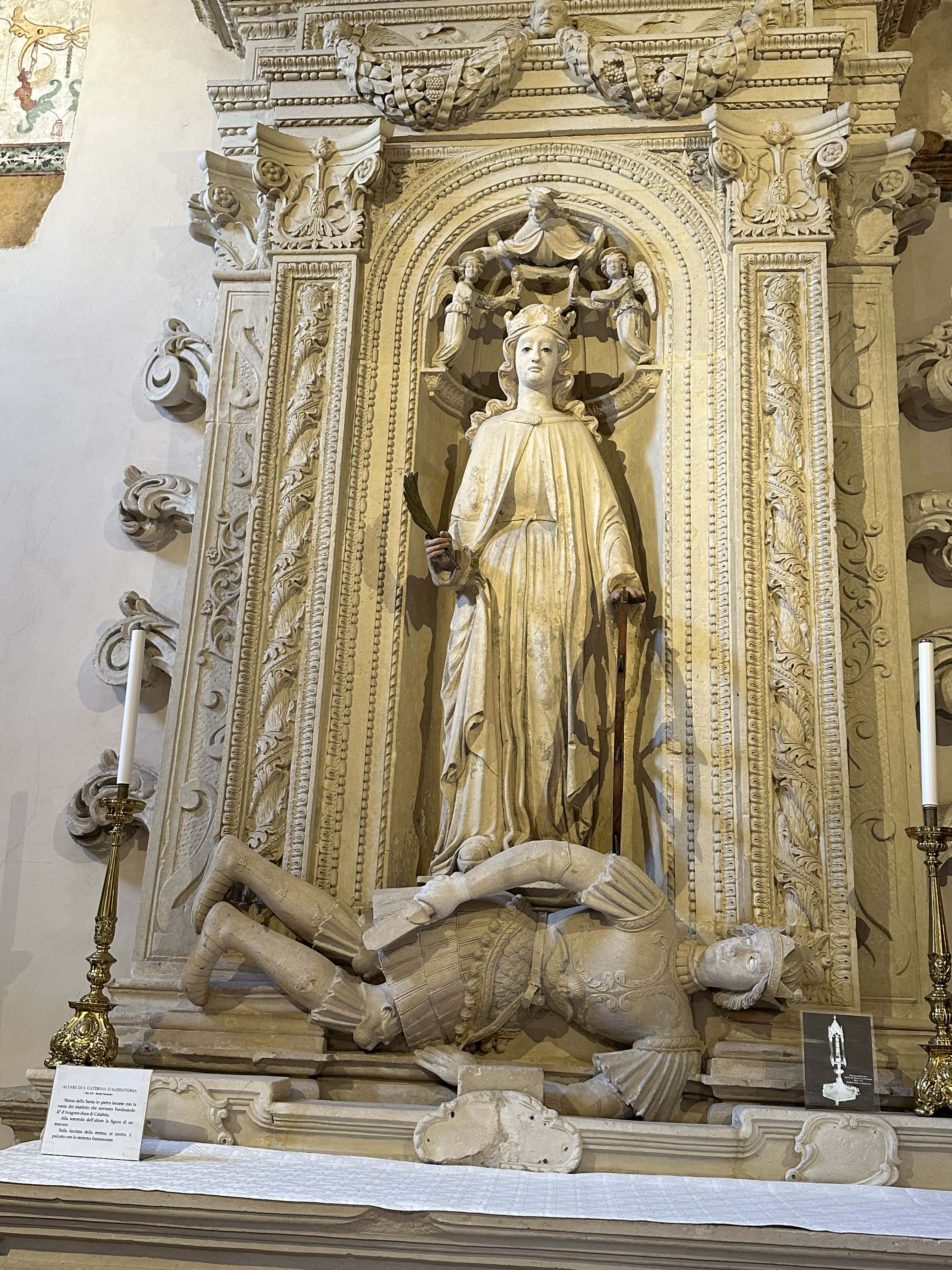 It was commissioned by a man named Romandello. He was the forth son of a local rich lord and not expected to receive any wealth from his father. So he became a crusader knight and a dignitary in the court of Naples. He married up to the countess of Lecce. Supposedly he bit off the finger of the dead St Catherine in Naples and brought it home to create a pilgrimage destination of the Church of St Catherine. He died six years after marrying the countess. She then married her husband’s enemy, the king of Naples. After 8 years, he died in battle. She returned from Naples and commissioned frescos for the church in her first husband’s name. She did not like the work and recommissioned the frescos to be painted again by different artists. The church is spectacular. All the scenes are from the Bible: the Apocalypse; Genesis; Life of Jesus; scenes from St Catherine’s life.
