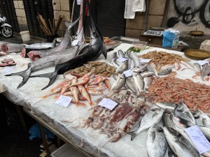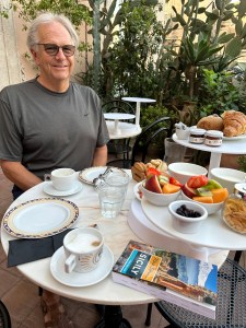 Breakfast was on the plant bedecked terrace overlooking a piazza. It was the usual European breakfast of cappuccino, cheese, lunch meat, fruit, yogurt and fresh breads. Each day we try to eat less, but are not very successful. Thankfully we don’t eat like this at home, or we would be blimps. Then we went for a stroll around the old town and observed that our hotel was literally on the same street as the busy and entertaining Fish Market.