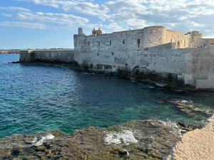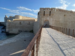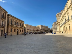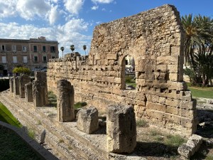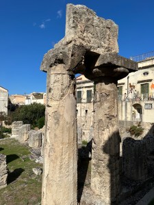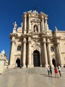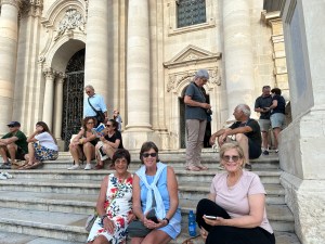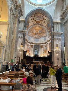 We changed, ate a fast lunch and drove in several cars to Syracuse for a walking tour led by Terry. It included Greek antiquities in the middle of the modern city, the ancient city walls, the large and lovely Piazza Duomo and the Cathedral, which had originally been a Greek temple, later replaced by a muslim mosque and finally by the Roman Catholic Church . We attended Mass in the Cathedral at 7pm and dinner at a nearby reserved restaurant at 8pm. The food was terrific. All went as planned by Terry. Love that boy.