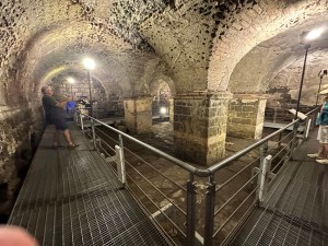 The Fish Mongers are all shouting about their products and wanting us to taste and buy different fish. Above the street was a roof of colored umbrellas that provide some shade and rain protection. Then we followed Rick Steves walking directions and saw several ancient buildings as well as churches and underground antiquities.