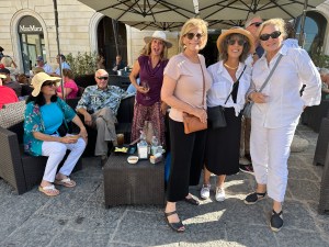 By 7:30 we gathered in the courtyard for dinner. The villa staff provided us with a delicious buffet with typical Sicilian dishes. The sky sprinkled on us and most of us moved under cover. Al Dover gave a lovely welcome thank you to Mark and me for hosting the week. It was very touching. Then I talked about housekeeping matters and Terry McAteer talked about the planned activities for the week. I was thrilled that everyone had arrived safely and were already enjoying themselves. Success. We had been so busy chatting that we forgot to take photos. Sorry.