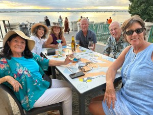 Mark and I busied ourselves deciding where to locate each of our 21 guests, putting name tags on each door and laying out T-shirts Mark had designed and made for everyone. Before we knew it, our first guests appeared and by 6:30 everyone had arrived, except Judith Ciphers, whose flight plans delayed her until mid-day on the 24th. The weather was very warm and the pool very inviting. As people arrived they put on their suits and hung out in the water. Everyone ordered cocktails and the party began.