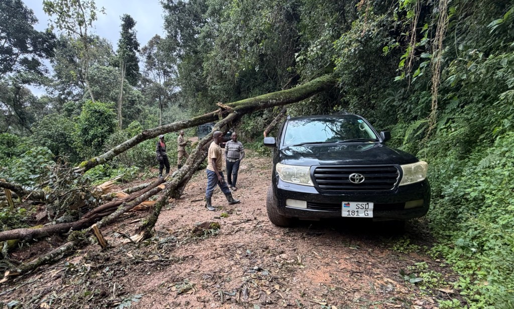 The road started out pleasant enough, but before 2 hours had elapsed we were tired of the mud and bumps and intermittent rain. About 3 hours into the drive, we encountered a fallen tree which we could not pass. No one of the cars who backed up behind us had any equipment and we were all reduced to waiting for nearby park attendants to show up and cut the tree.