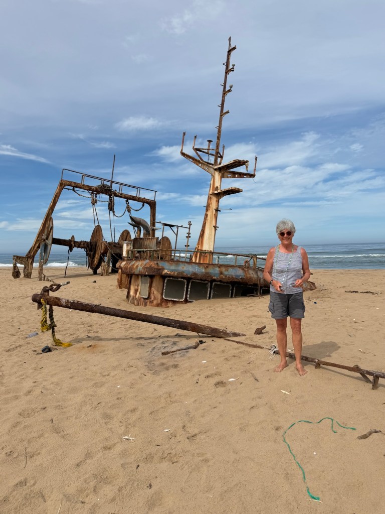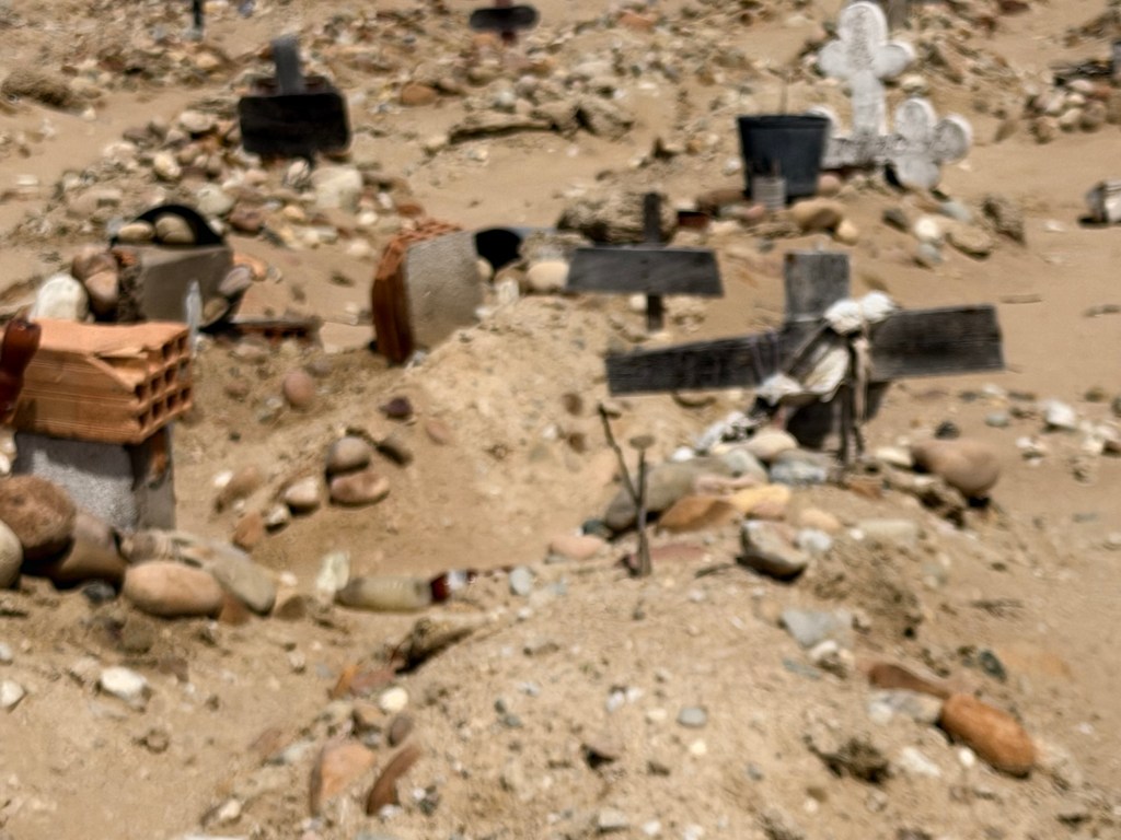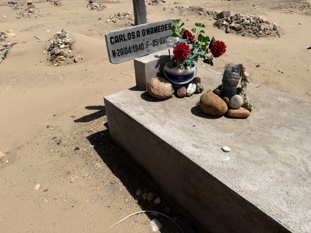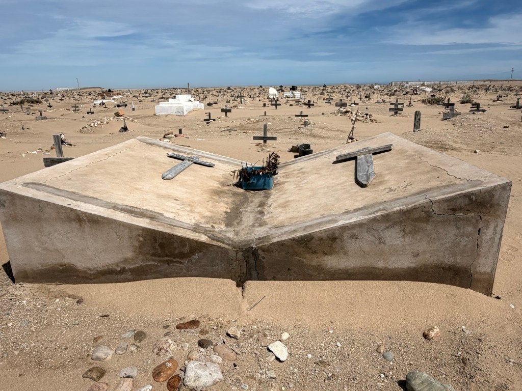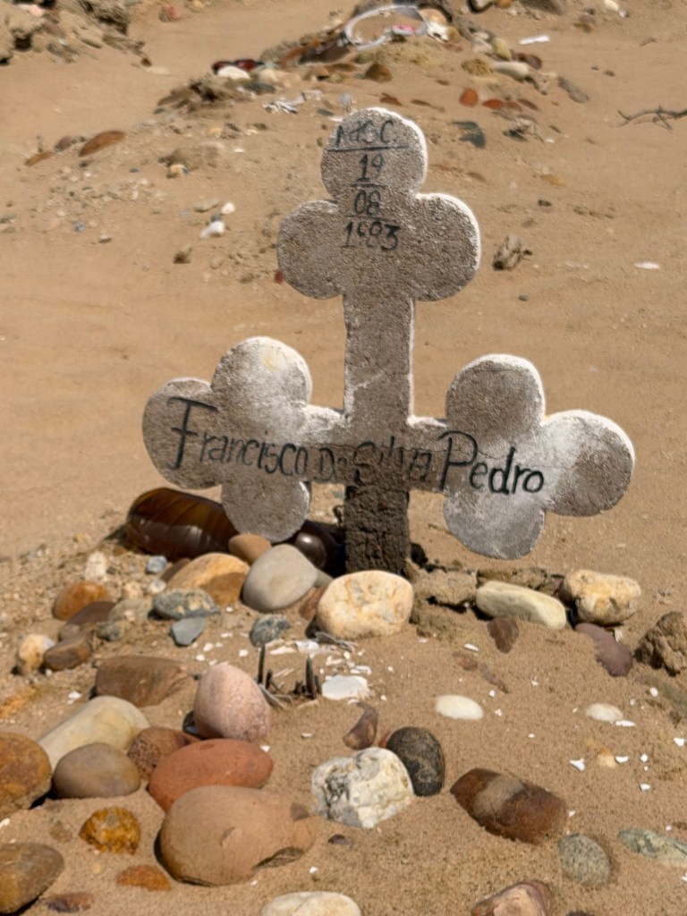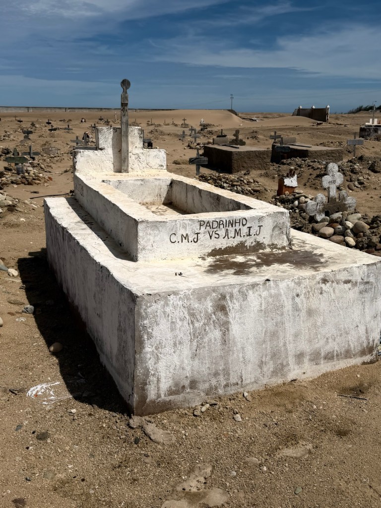 Another travel day. We broke camp early and were on the road by 8am. We returned over the same rough dirt roads 3.5 hours back to Moçâmedes. After a fuel stop with gas at $1.62 per gallon (fuel is supported by the government), we headed north and then west a couple of hours to Praia da Mariquita, a rustic beach lodge on the Atlantic ocean. Along the way we stopped at another shipwreck and a cemetery.