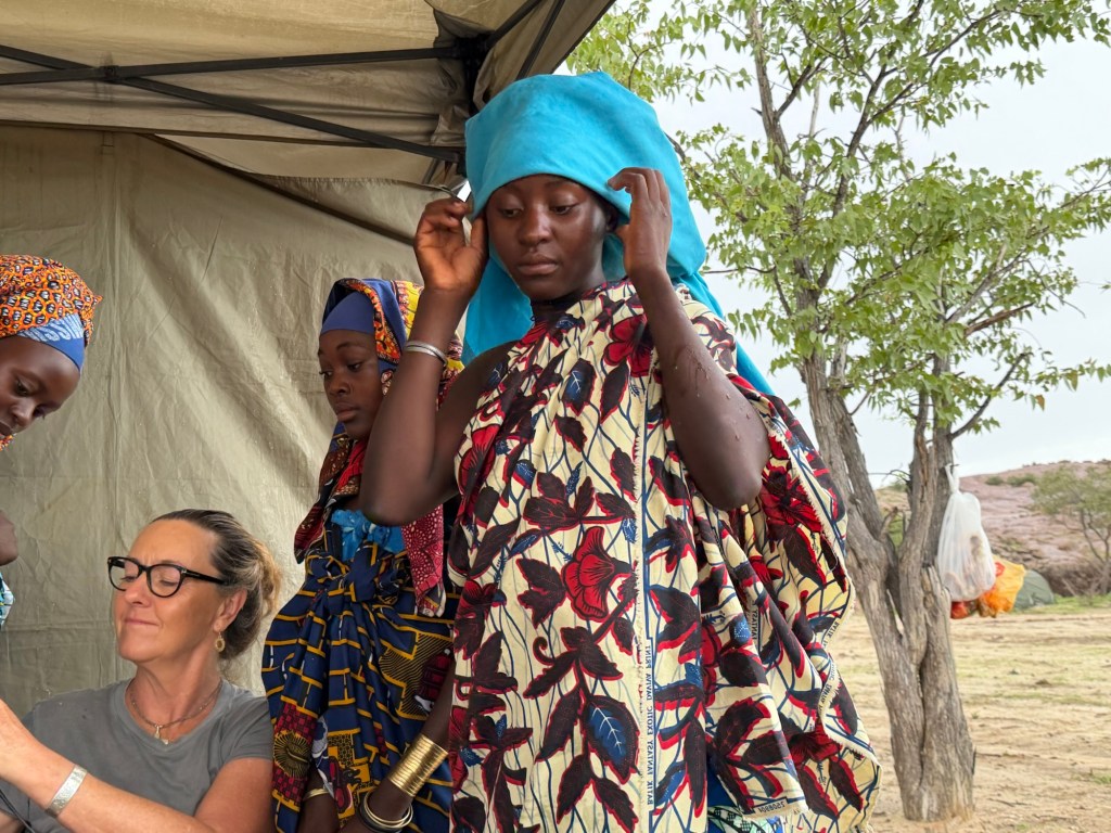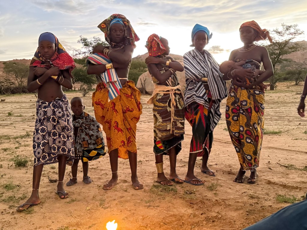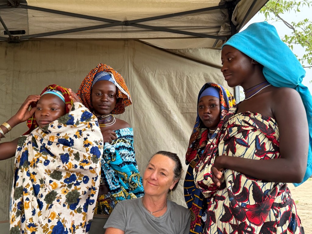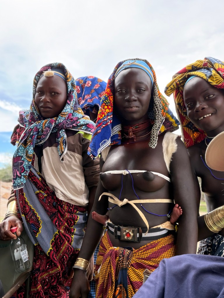 The women are generally topless and wear a tight strap across the top of their breasts which is designed to point the nipples upwards. It is a tribal custom but looks uncomfortable to me. They also cut and file their two top teeth so that they are slanted away from each other. The effect is disappointing to look at, as their appearance is very attractive otherwise. Their clothing consists of colorful fabrics in the shape of tablecloths. They tie the ends around their chest or over the shoulder and let it hang.