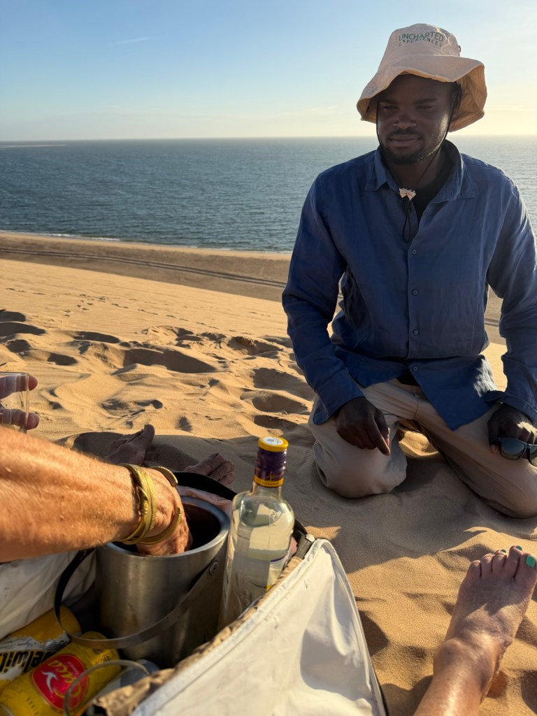 It only took 10 minutes to get to the top, as Hugo and Mark together gave me a strong pull. At the top we sat enjoying the sunset. Stallin climbed up with snacks, and another staff person, Zaire, climbed up with drinks. Did we feel spoiled or what? Once the sun had set, we scooted down the steep dune to the beach. We had a good time making a mess of the dune surface. The beach itself was flat and calm. Claire went for a swim, but we did not. Stallin started dinner late and we did not eat until 10pm. He promised not to be so late in the future.