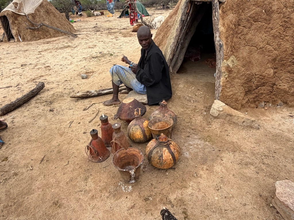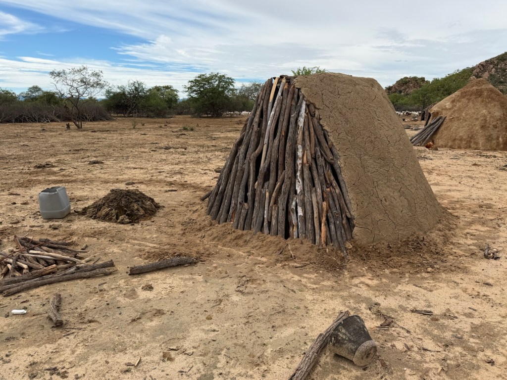 The tent shaped structures the tribe lives in are covered with a mixture of cow dung and mud to keep out the weather. They last several years before having to be remudded.