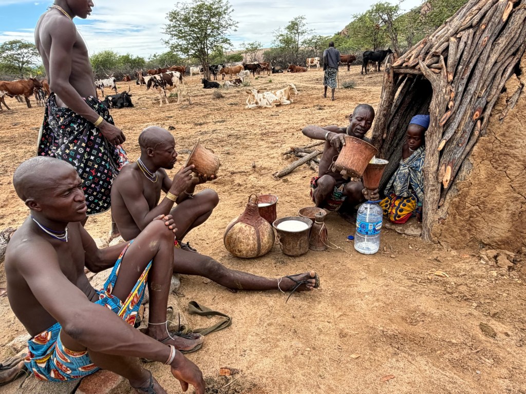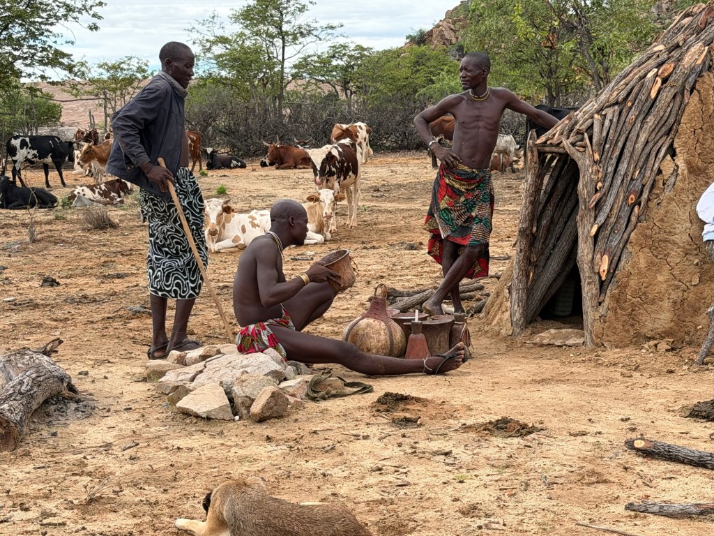A few of the locals followed us. The art was carbon dated at 20,000 years old and is believed to be made by the Ovatwa people who inhabited this area at the same time as the San (bushmen) people. The view from the rock hill told us there was more to see, so we walked down the hill and headed for the Ovakuvale village, their large cattle, goat and garden bomas and the action we observed. We met the village elder and learned about him and the Ovakuvale tribe.