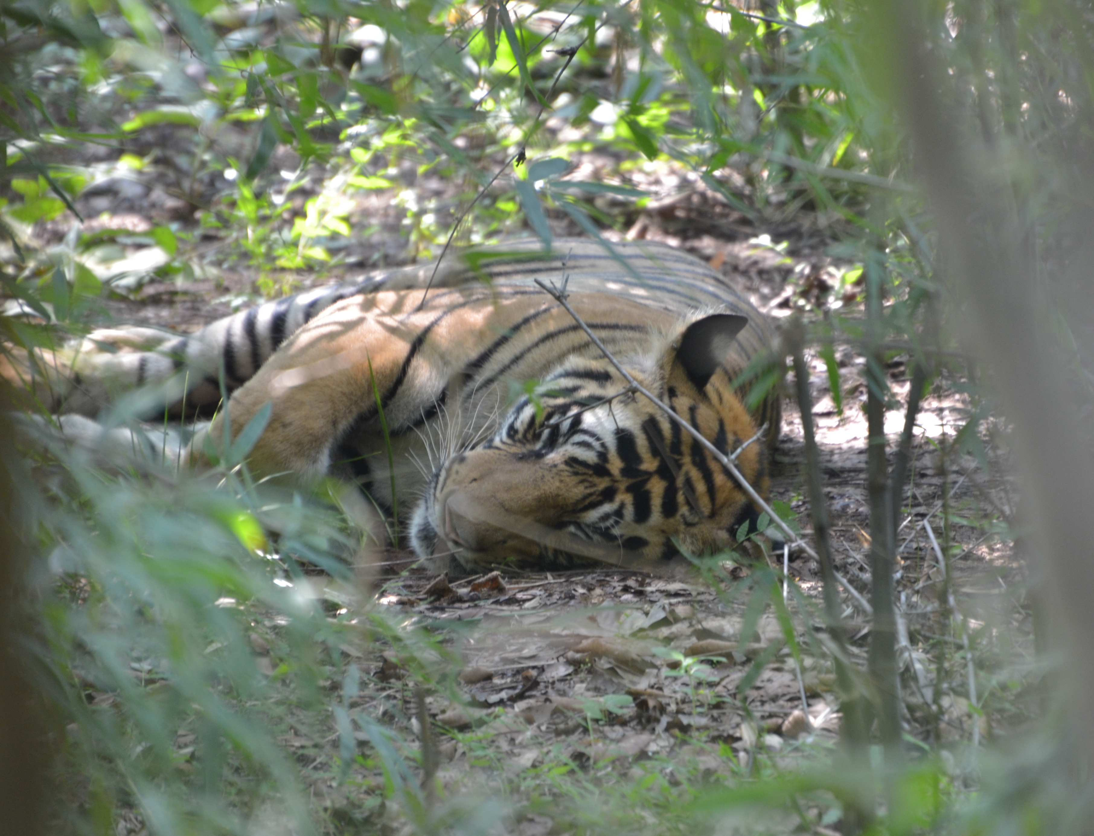 We parted company in Delhi and Mark and I caught a flight to Jabalpur, where we were picked and driven 3.5 hours to Mahua Kothi Resort near the Bandhavgarh National Park. The whole transfer had taken 12 hours. Our accommodations were …well, different. We had our own house complete with a large outdoor patio, full bath, king bed and sitting area. The whole building was made of bamboo, mud plaster and woven mats laid over over a wood beam ceiling. The floor was covered with tile and woven mats. A dirt pathway lead between the houses and public areas. It was quite charming and comfortable, even if a little rustic. We were served a lovely dinner on the open air roof of the restaurant building and went directly to bed.