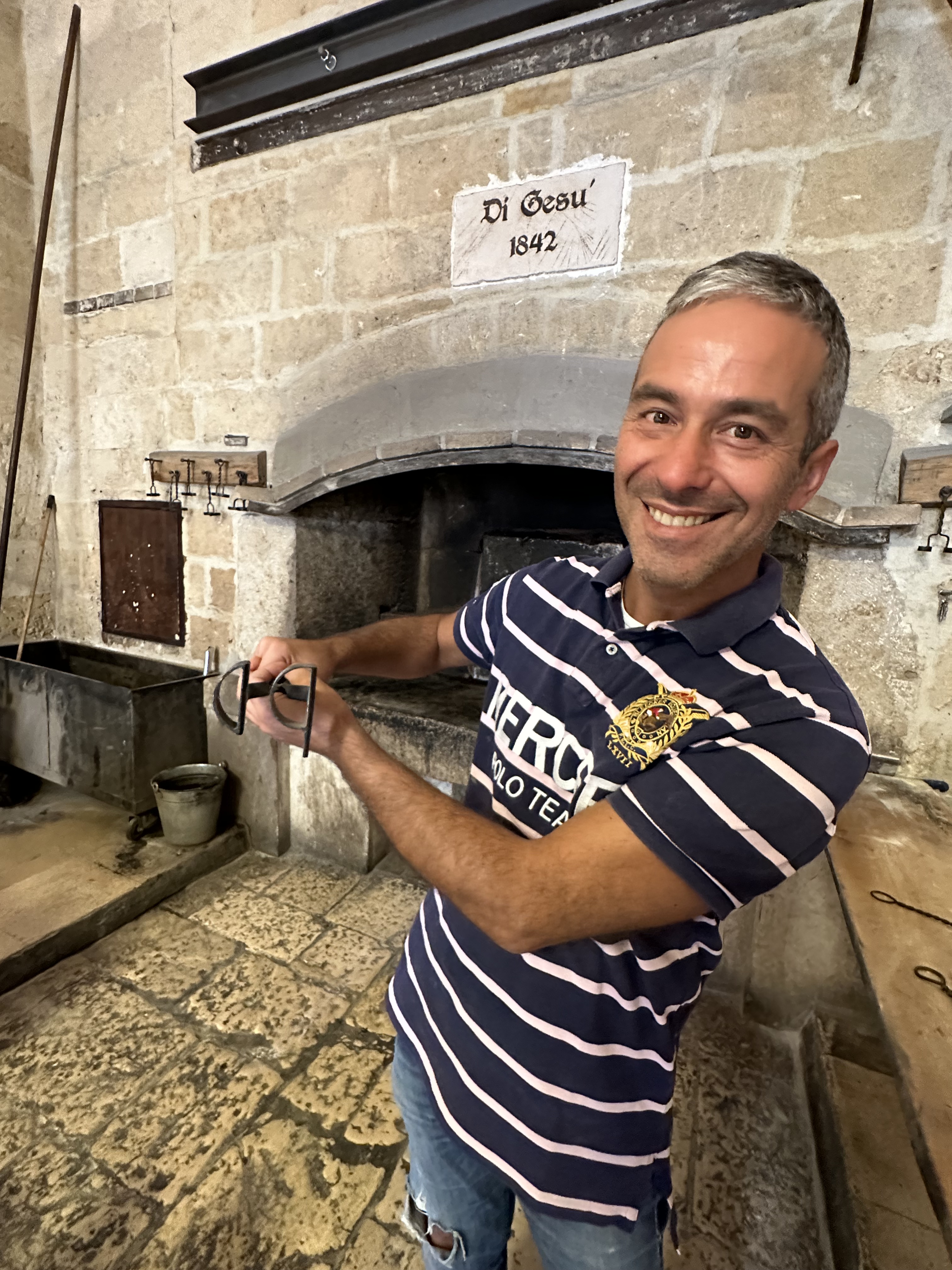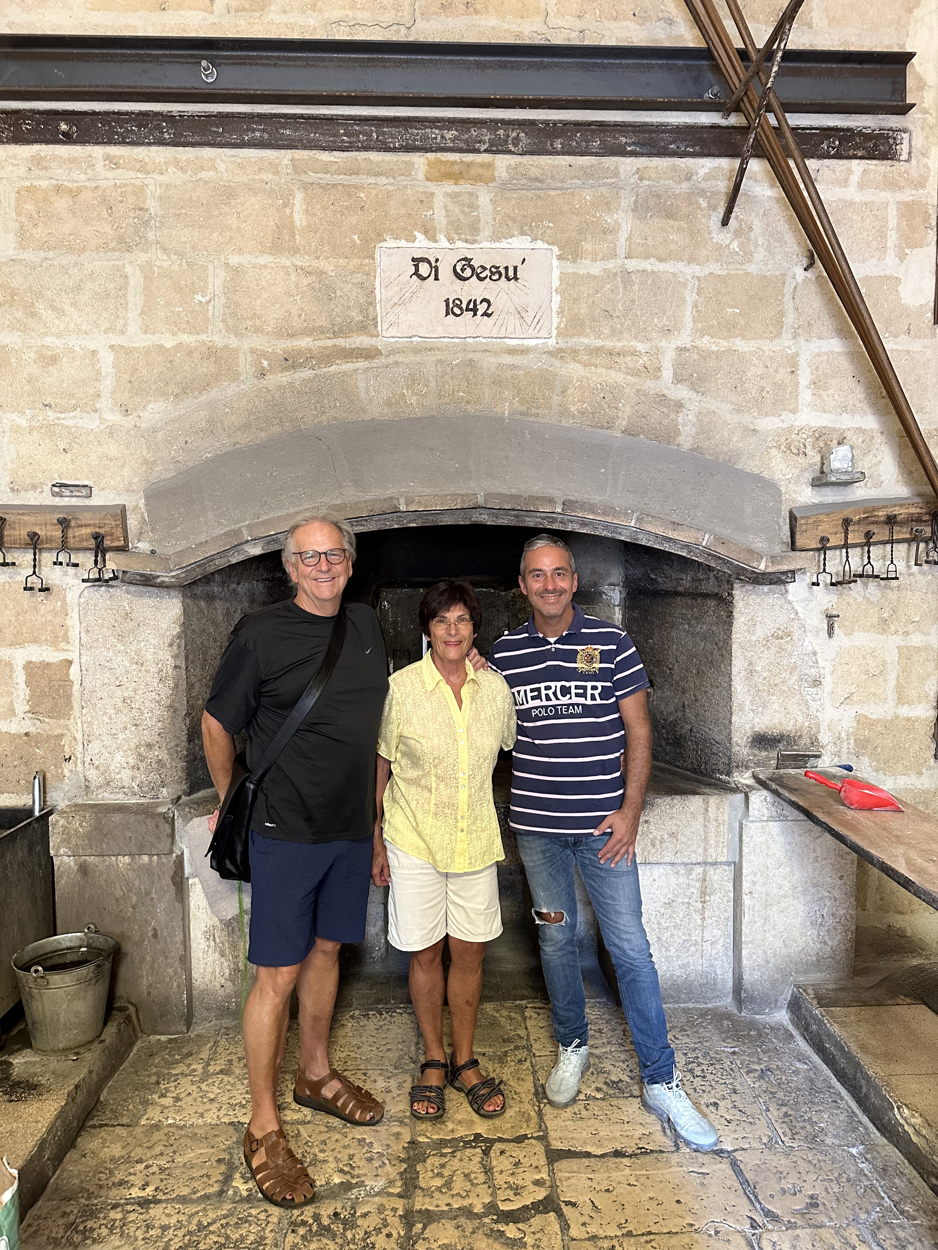 We were picked up by our driver, Massimo, and left Matera for Altamura and Castel del Monte. We rendezvoued with our guide for the day, Silvia, at the Di Gesu Bakery in Altamura . We were met by Giuseppe, the 5th generation proprietor of the business. He was quite proud of his product and walked us through the steps of making the best bread around. We had to admit that it was very tasty, soft in the middle and crispy on the outside The wood burning oven behind us in the photo is 6 meters in diameter. Quite huge. It takes 40 minutes to load the oven and the best bread is what goes in first and comes out last.