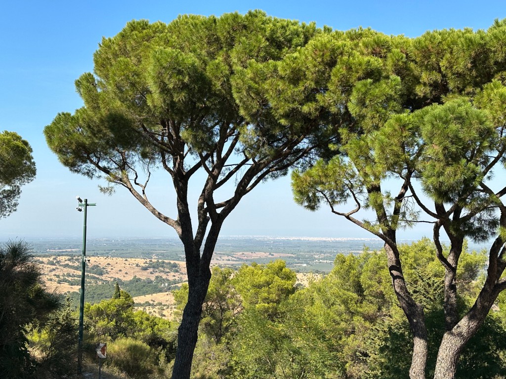 Mediterranean pine trees with rolling hills in backgroundApproaching Castel del Monte