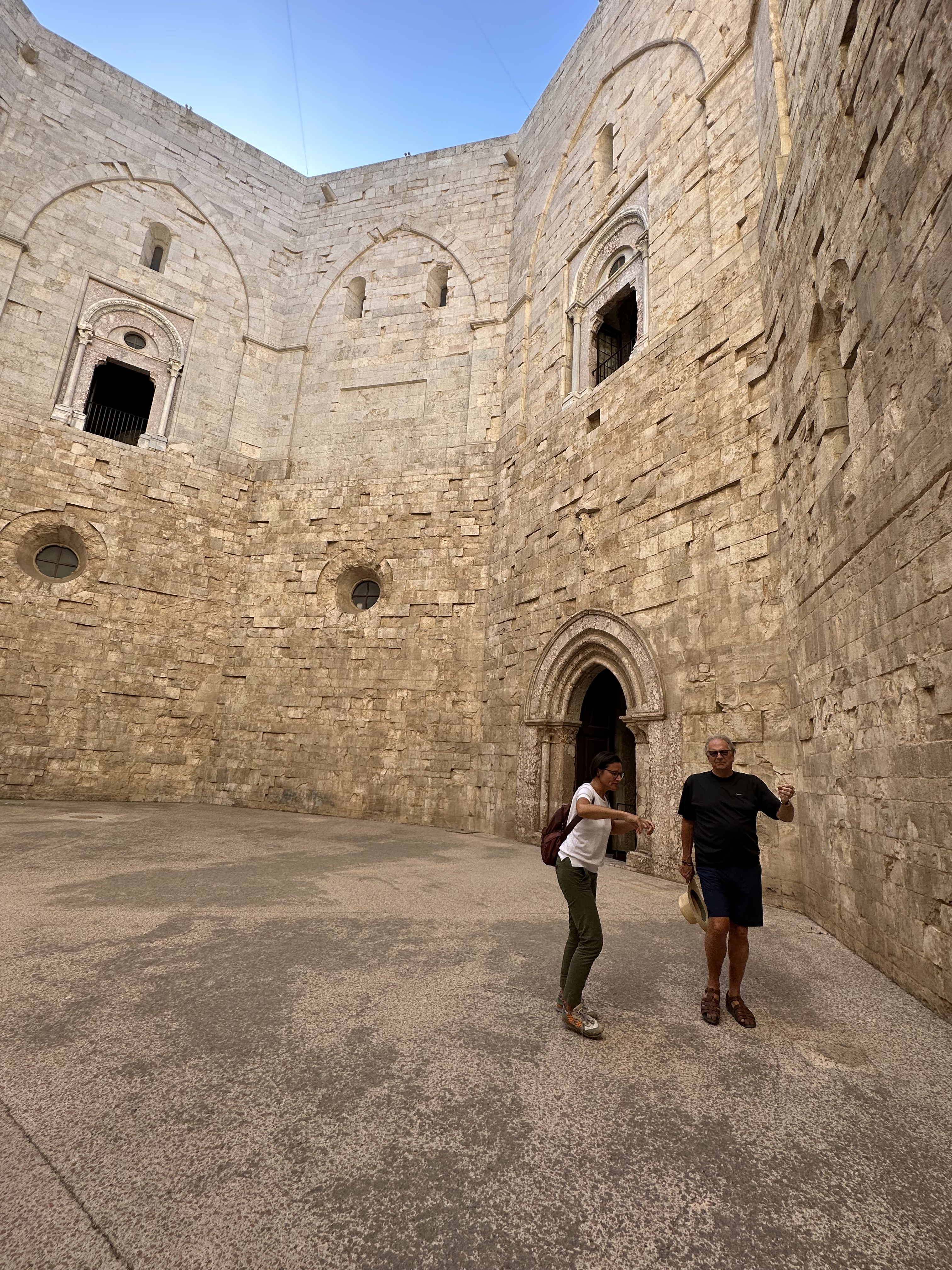 As we approached the Castel, the conversation turned to Frederick II, who commissioned the castel in the 1240’s. He was born in 1194, became the king of Germany in 1212=]\ and Emperor of Italy and the Holy Roman Empire in 1220. He was a Christian, but was excommunicated 3 times by the pope. He died in 1250 after having been a forward thinking leader and commissioner of great works.