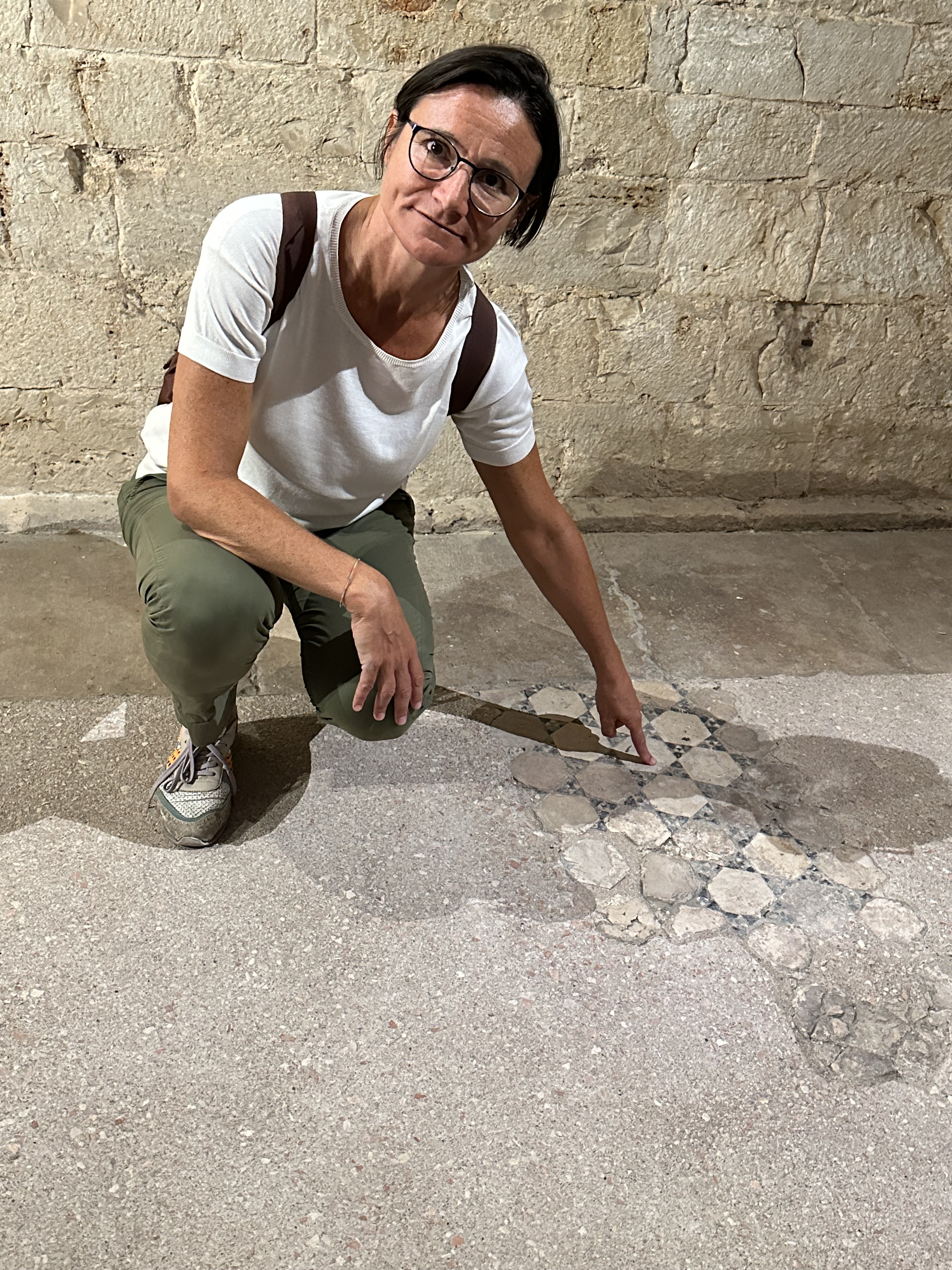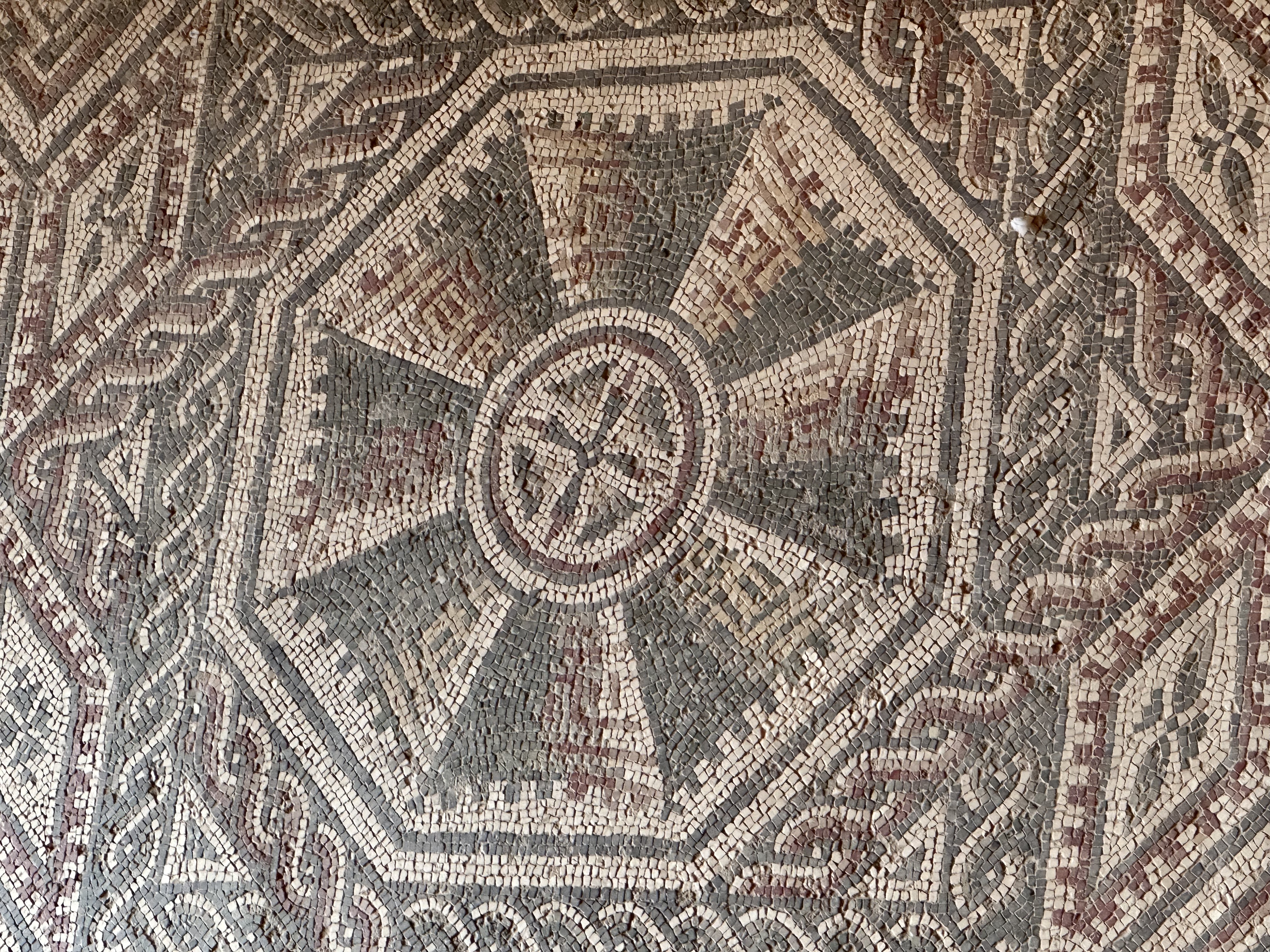 The ladies above were gymnasts or olympians. Notice how different they look from women in other scenes, who are much more voluptuous. There are scenes of hunting for animals; bringing animals from Asia and Africa onto a ship. Carrying animals in boxes. Catching fish in nets. Pictures of many different animals. There are intricate geometrical patterns throughout the property in the service areas and passageways. Below are people gardening and harvesting plants; Mermaids swimming with unusual fish; voluptuous naked ladies with animals and fish and more. It was a lot to take in. It is unknown who the family was that lived in the Villa or who built it and designed the rooms. The tile has survived in such perfect condition because it spent centuries covered with mud from ancient earthquakes and mudslides.