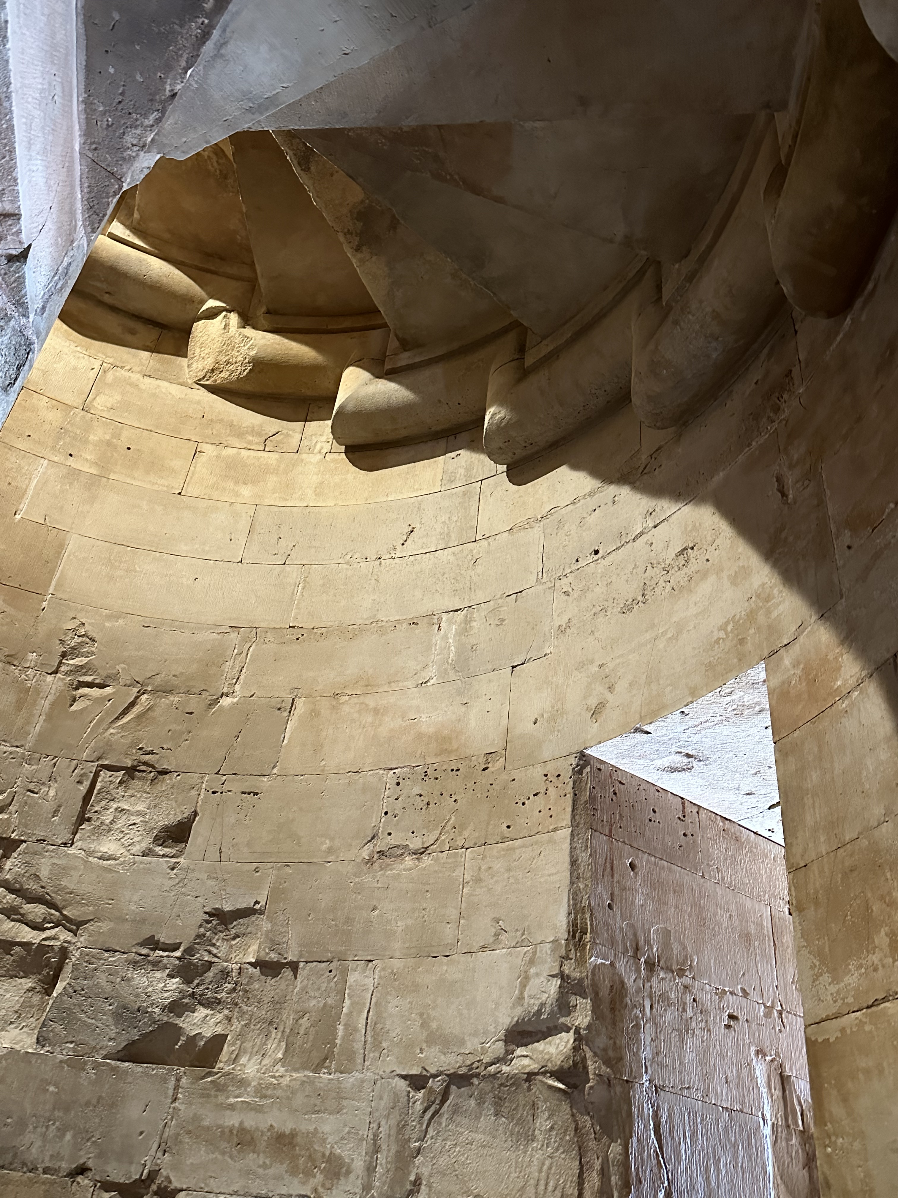 On that note we all had a coffee and then hit the road for my big goal for the day, the Castel del Monte an hour north of Gravina. The countryside was mostly gentle rolling hills. Very lovely even though the fields were mostly brown cut grass. Trees were very sporadic but added variety to the sameness of the undulating hills. Most of the buildings we saw along the way were abandoned farm houses. Farming and sheep raising had once been the main economy of the region. Today the economy is mostly olive oil, then olives and grapes, followed by almonds, fruit trees and then wheat–the crop we were passing through.