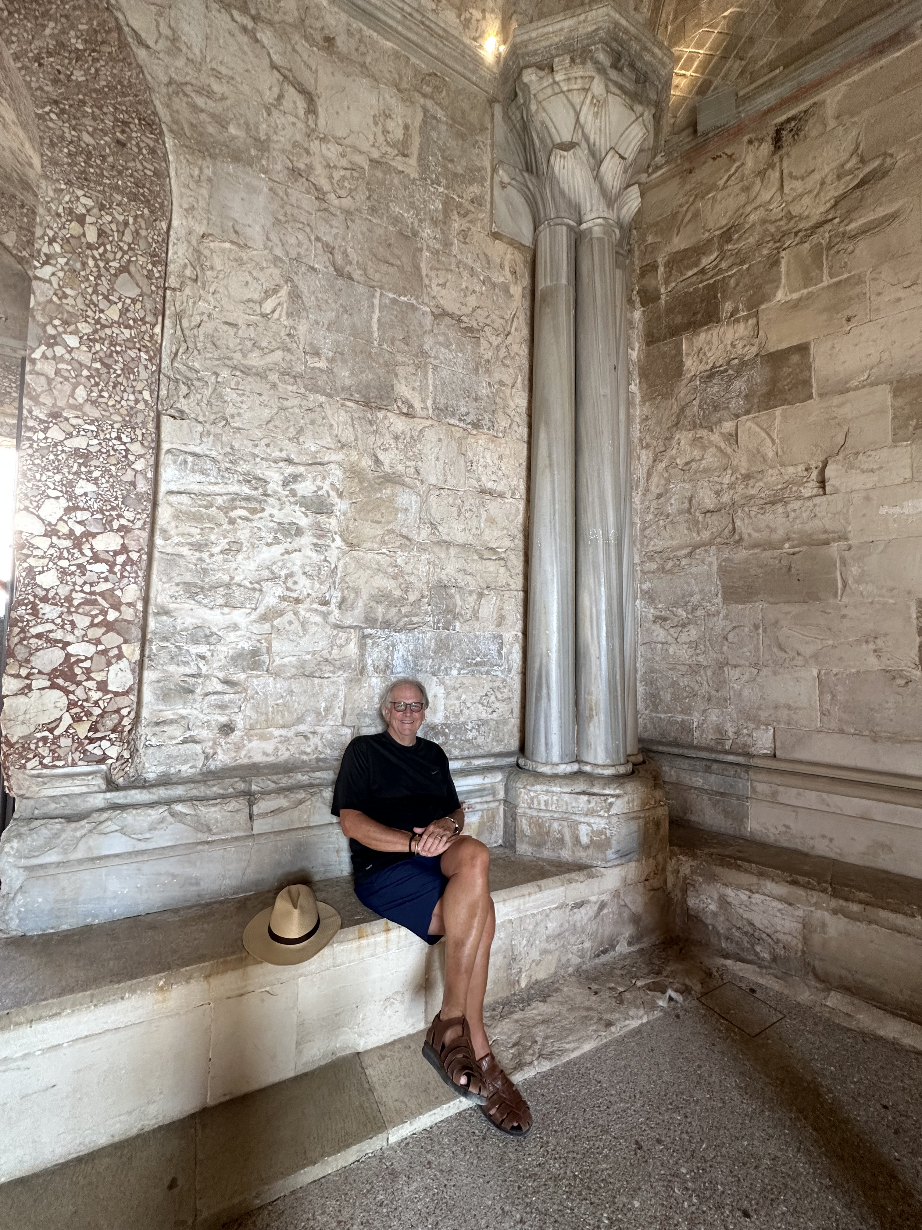 The town was packed with tourists, many of whom were from ships parked in the bay at the bottom of the town. After wandering past many upscale shops and interesting facades and churches, we reached the 3rdcentury BC Greek-Roman Amphitheater on the same level as mid-town. It affords a super view of town and the sea in the distance. Then we stopped at the Hotel Metropole in the middle of town and had a pizza and beer.