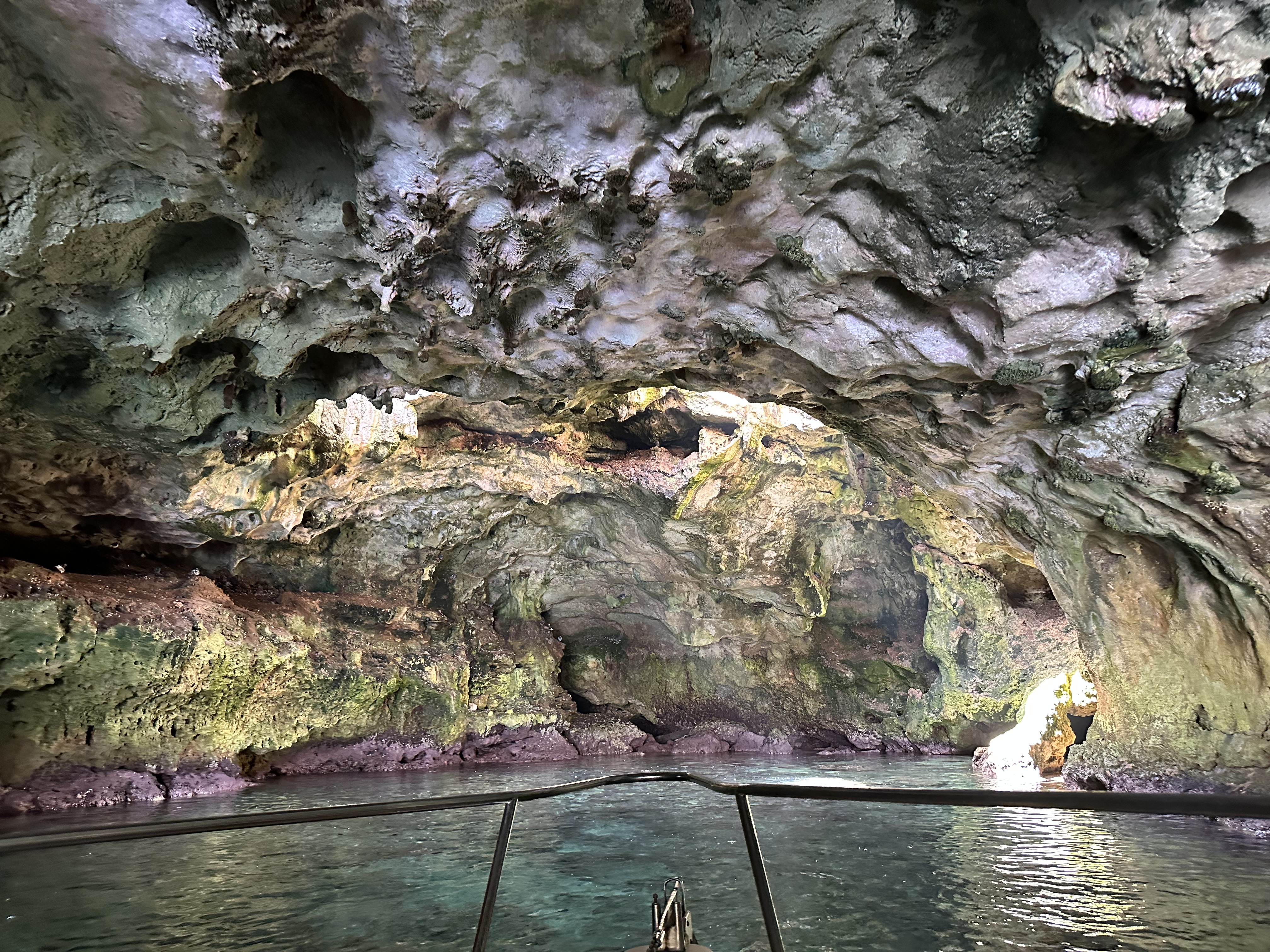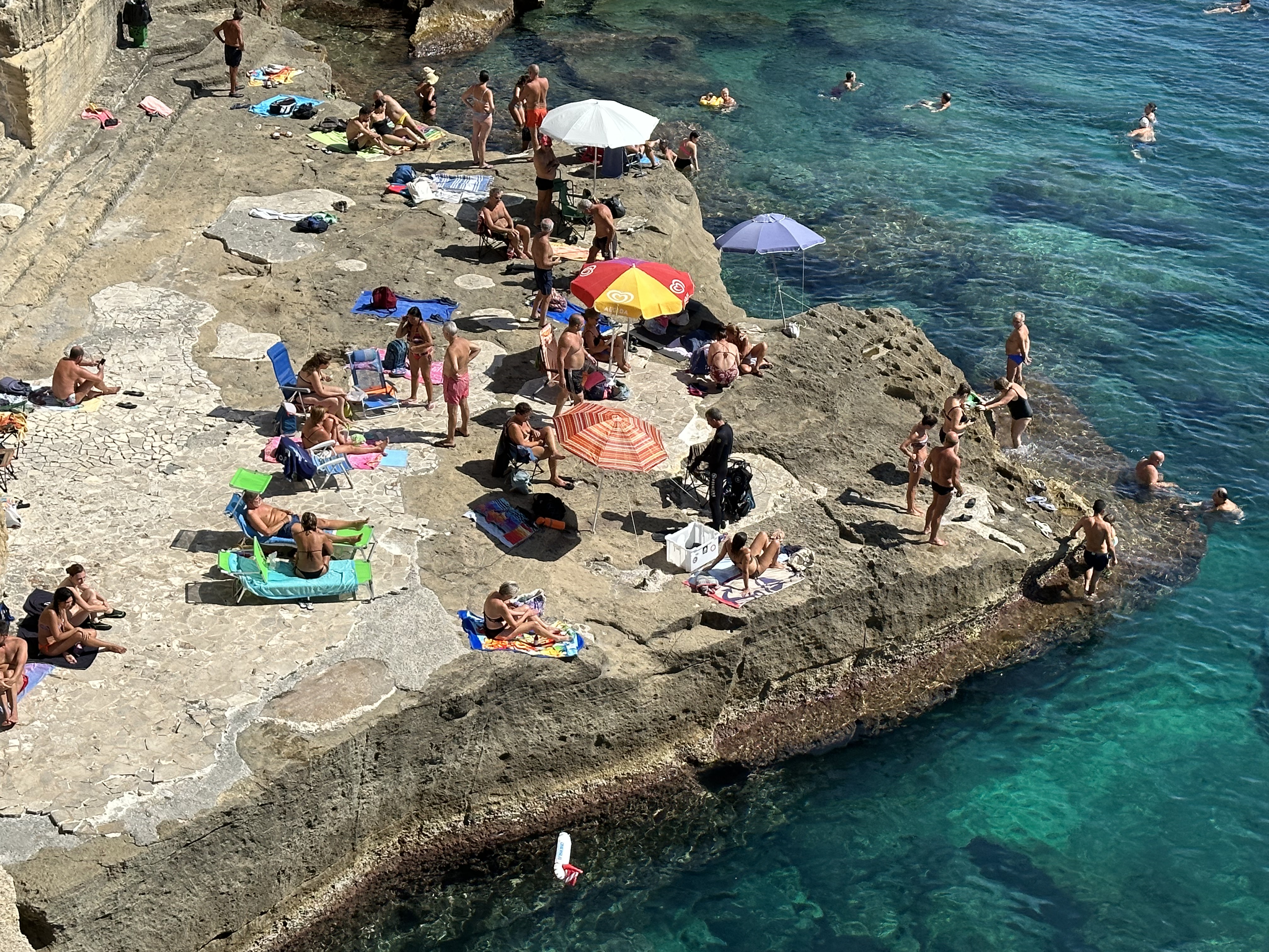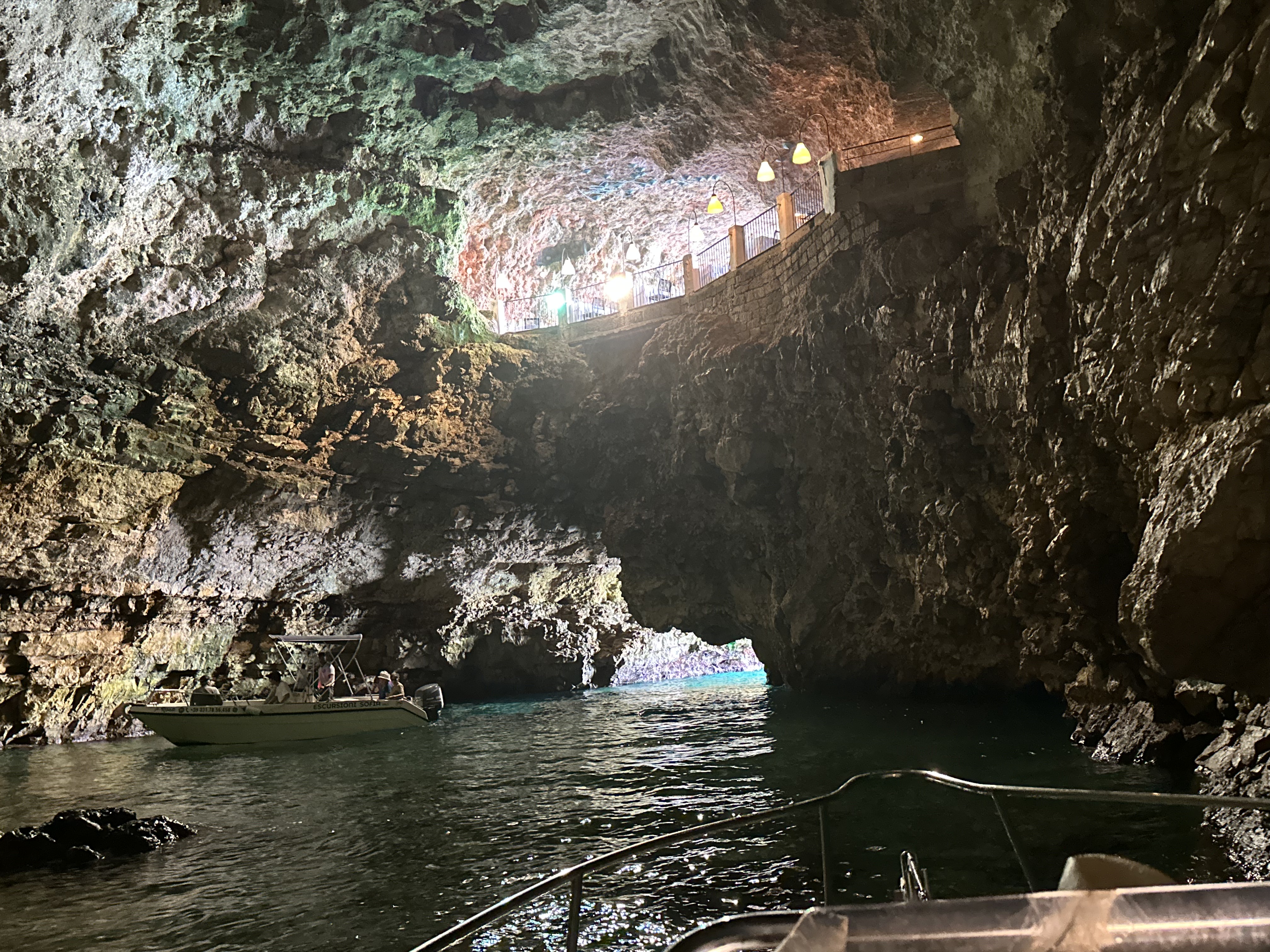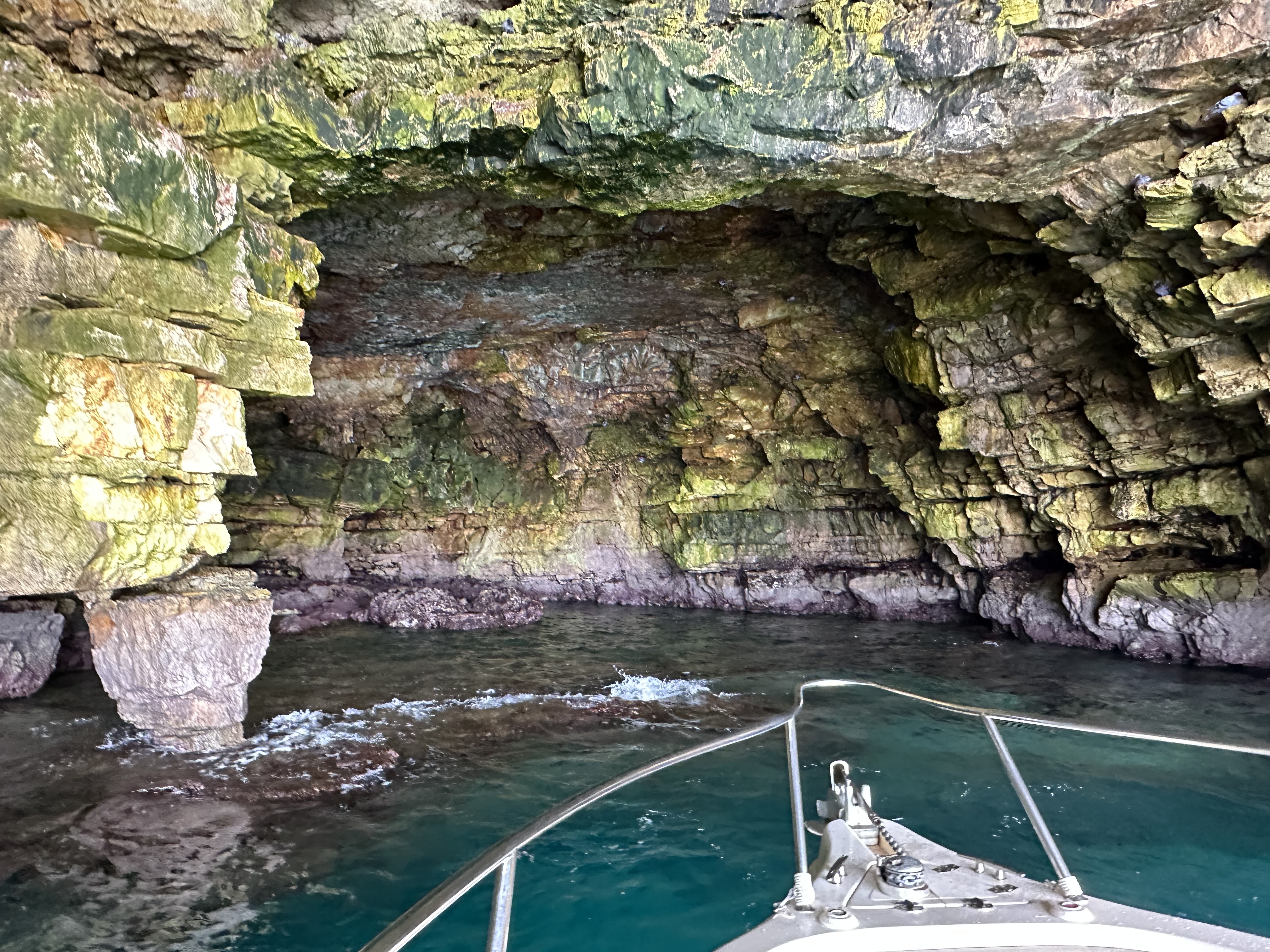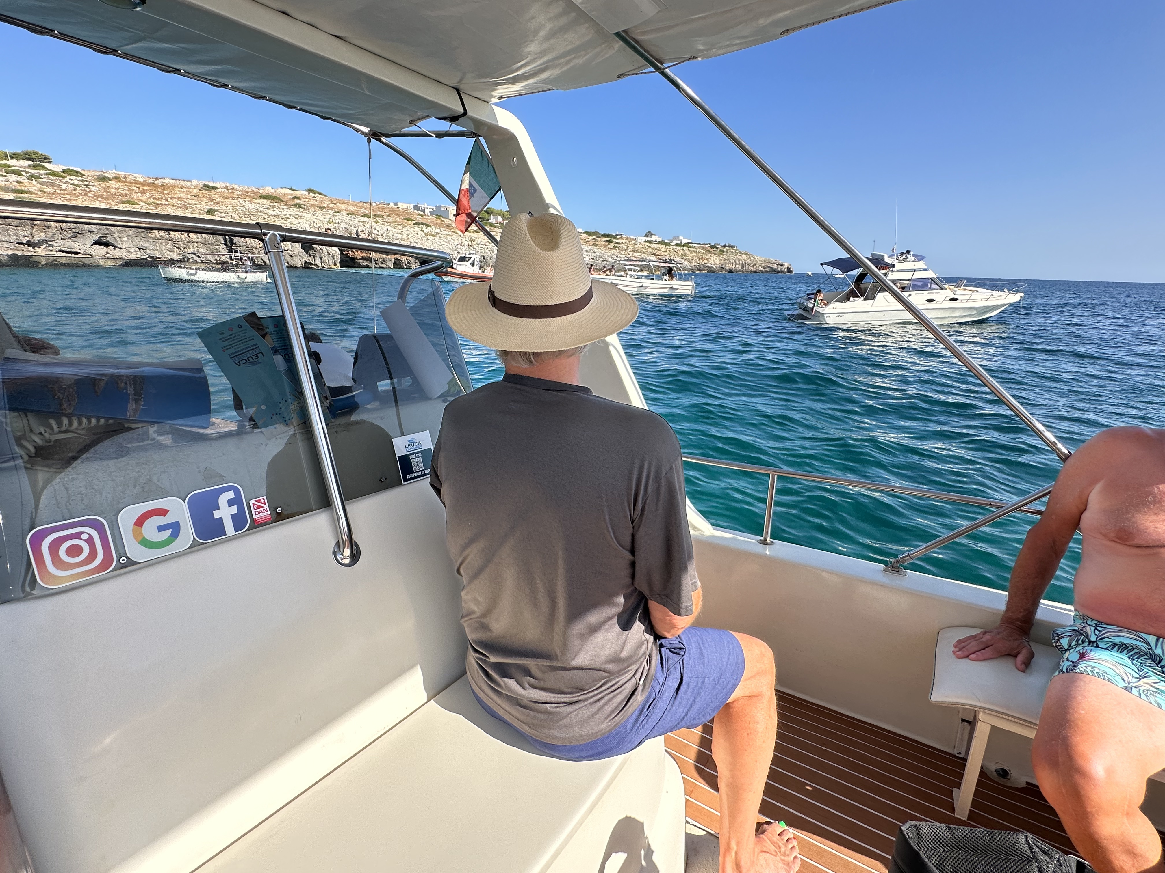 After lunch we drove to the tip of Puglia and got on a small boat with 6 other people. First we motored up the east coast through the usually rough water of the Adriatic. The boatmen stopped several times at various caves to show us points of interest. After the first couple of caves, we were ready to be finished as there was nothing special to see and the caves were too shallow to enter. Eventually we turned around and headed south to the place where the Adriatic and Ionian seas meet. Almost instantly the water calmed down. Turns out the Ionian See is always calmer than the Adriatic. We saw a few more caves and stopped twice to snorkel and swim. Mark and I had not intended to swim, so we watched the others.