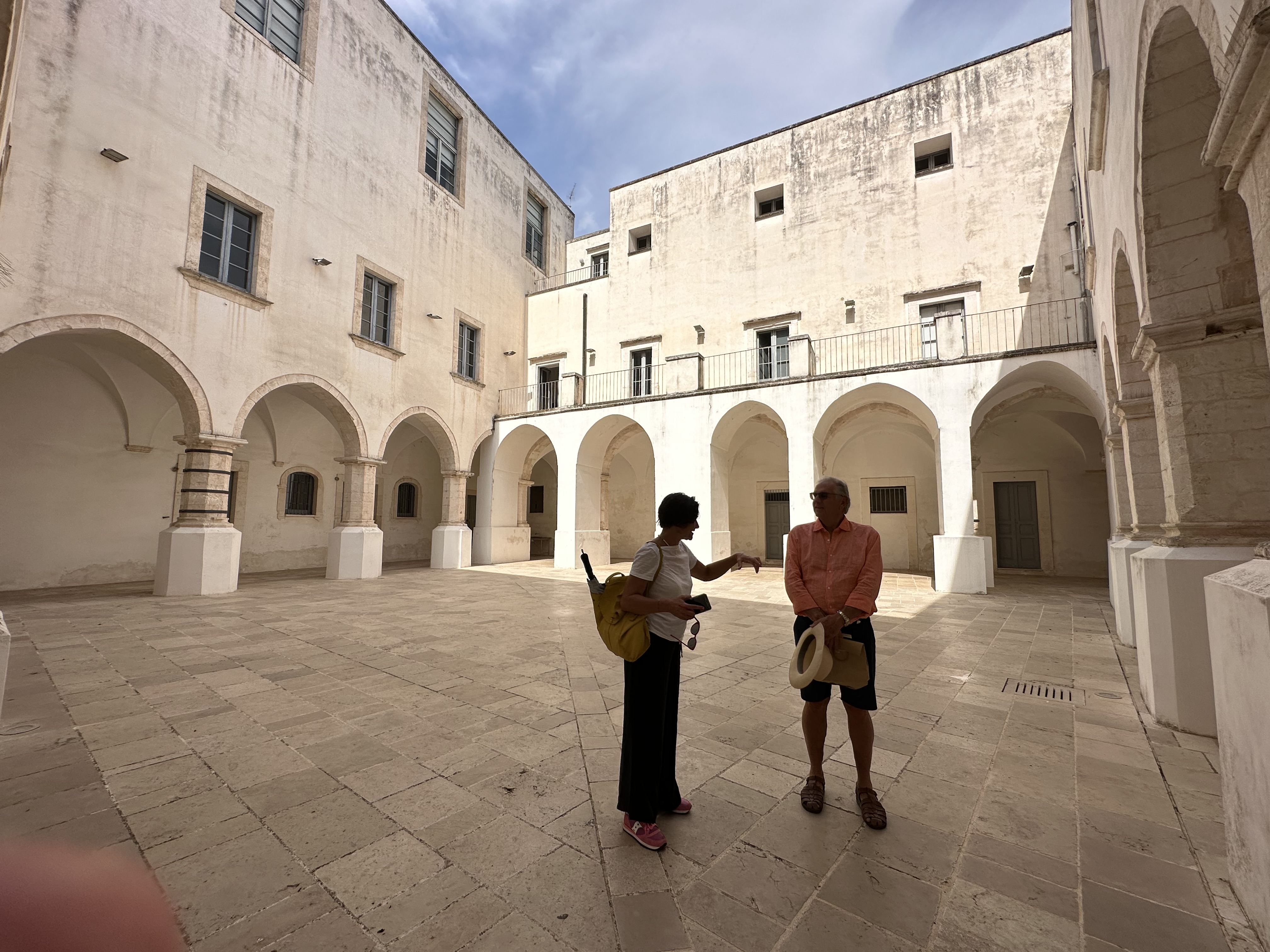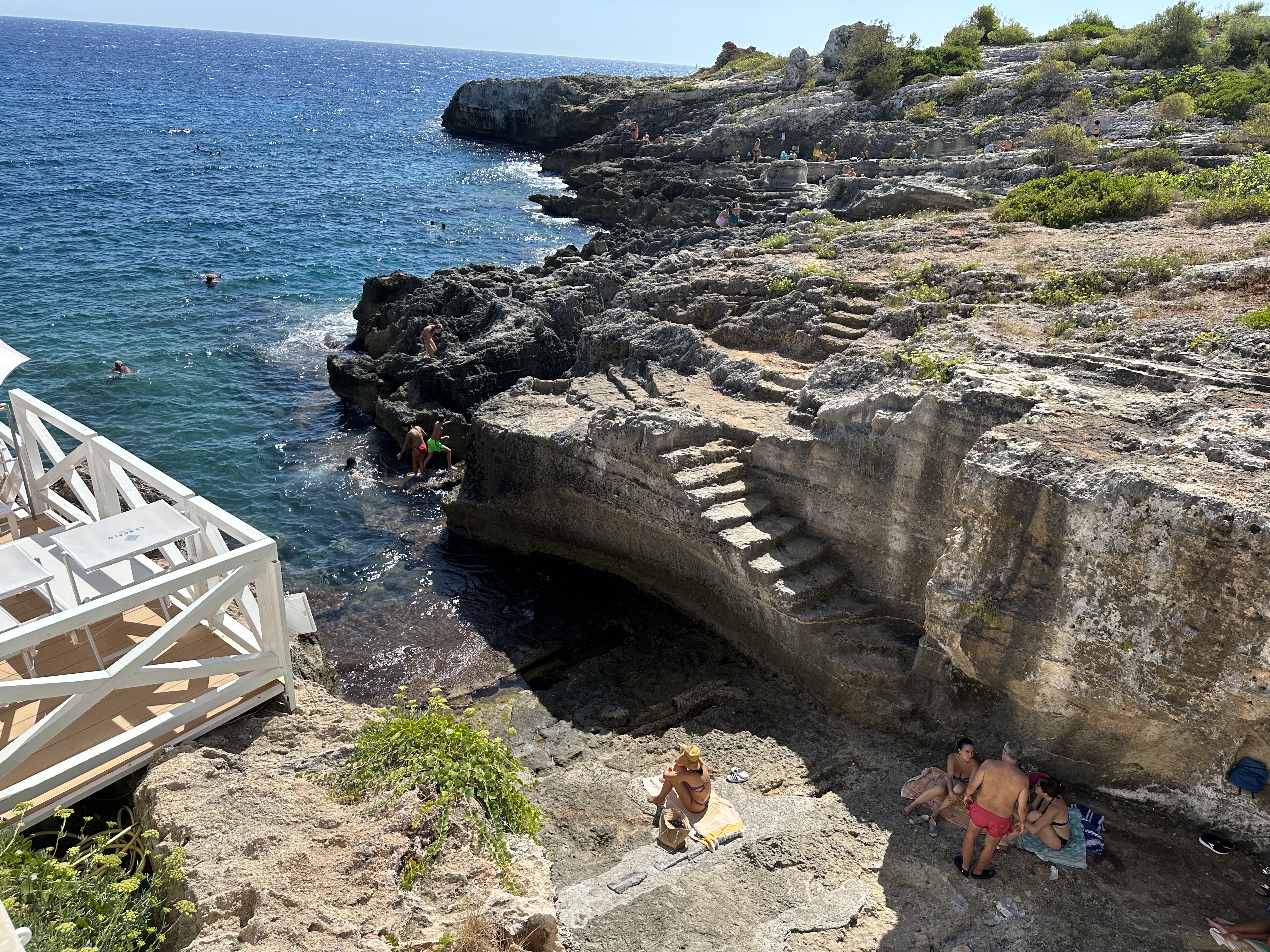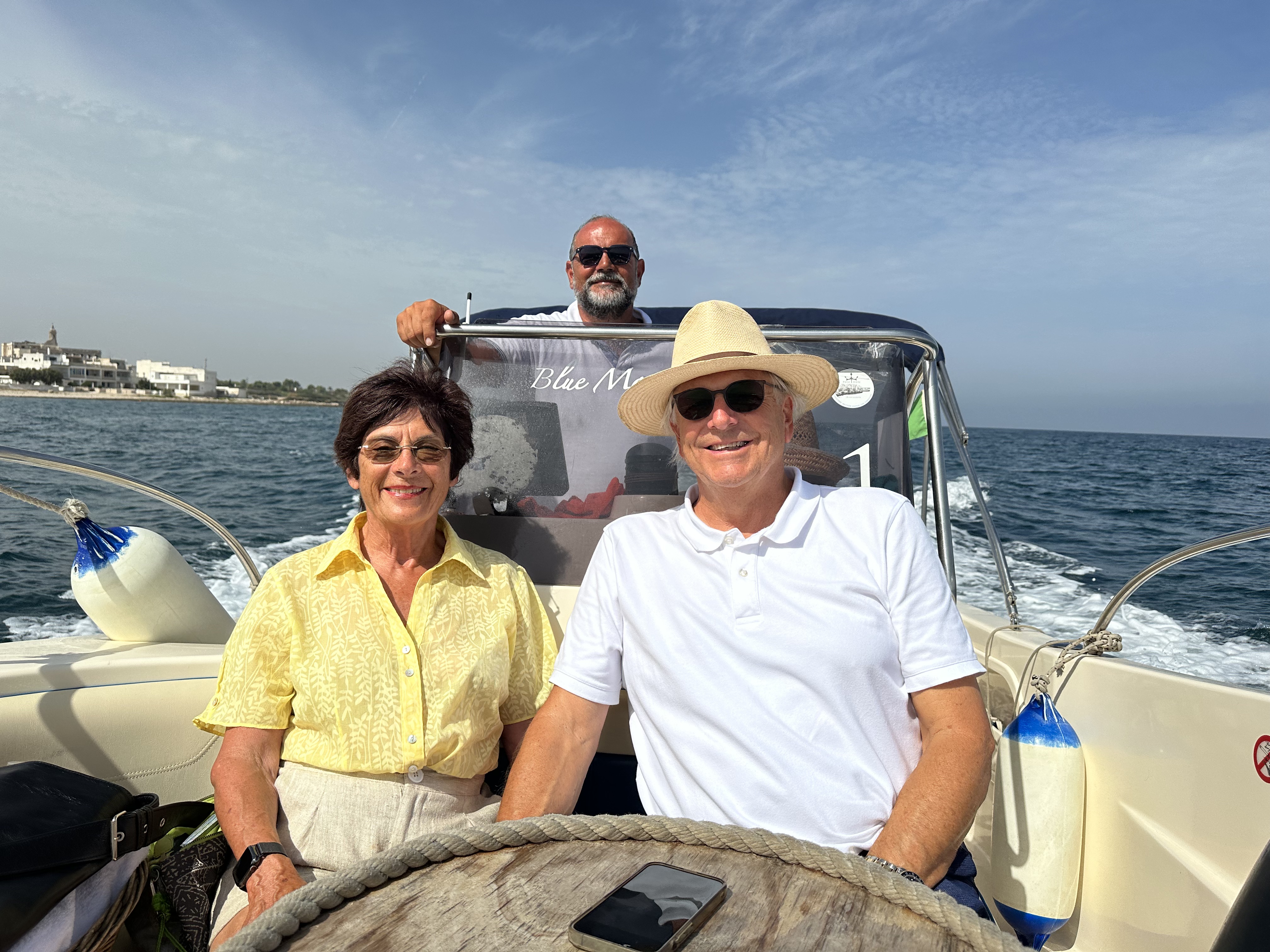 We’v been slowly working our way up the east coast of Puglia and today we visited Polignano. It is a small seaside town with colorful character. Our new driver, Carlo, is the owner of the company that has been driving us around. He speaks very good English and was very pleasant to be with, especially as Silvia did not meet up with us until we reached Polignano, an hour after departing Ostuni. His tourist driving company is very lucrative and he and his wife and daughters are able to travel a fair amount. He goes to Sicily every year and has been to the US 4 times. He was driving us in a new Alfa Romeo today. We met up with Silvia at Elisa’s office at her guide service company, called Southern Visions, in Puglinano. We visited awhile and complimented Elisa on the excellent service we have received.