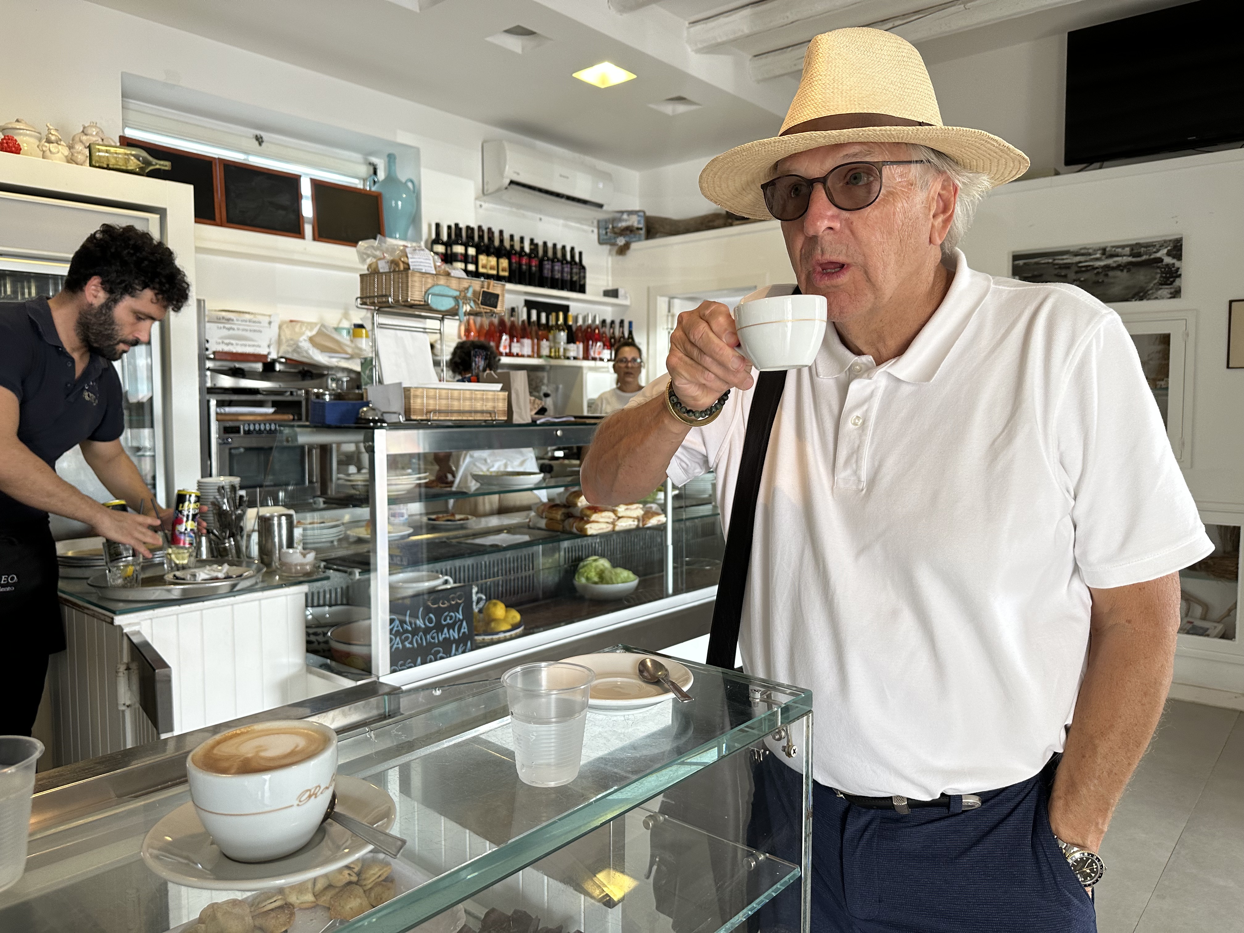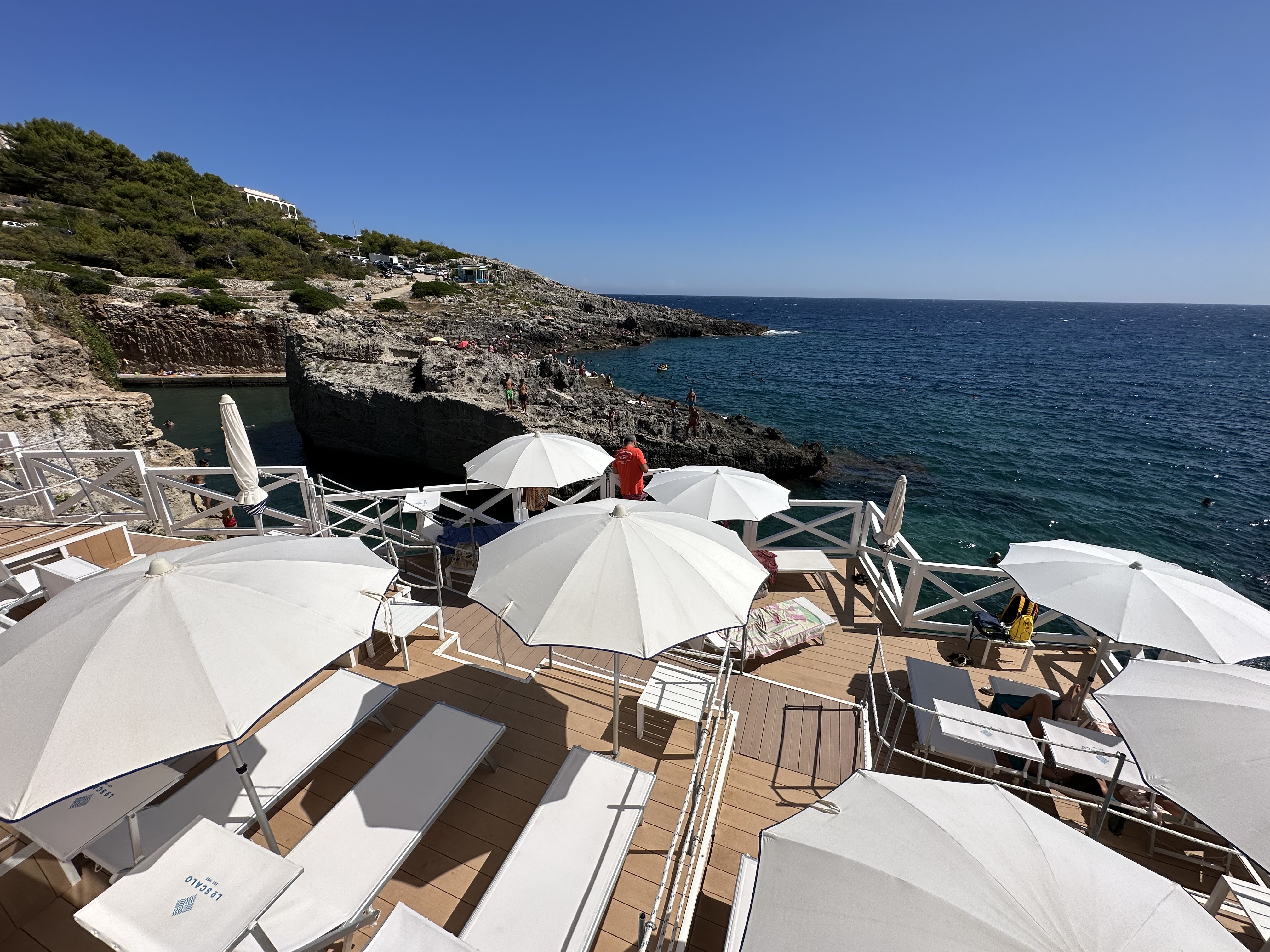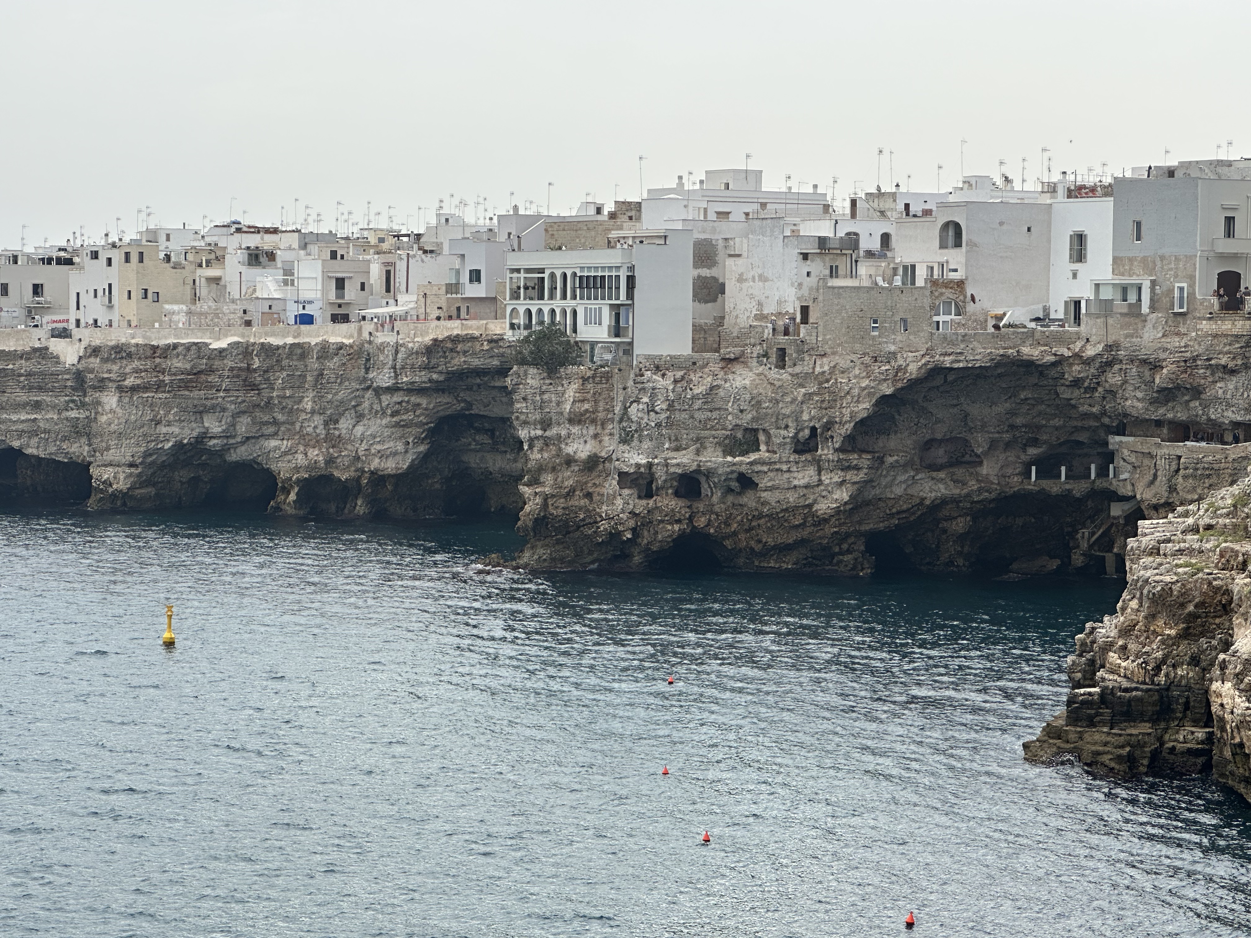 Mark downs a cappuccino before going boating A beach sceneWe are on the Adriatic in Giuseppe’s boat headed for caves. Inside a caveCanyon Beach from the city sidePolignano a Mare city hangs on the edge of the cliffs.A very colorful cave A shell attached to a cave wall. An underground restaurant as seen from inside a cave.Looking up at the town from a place we hade looked out at the water.The cliff hanging town of Polignano a Mare.