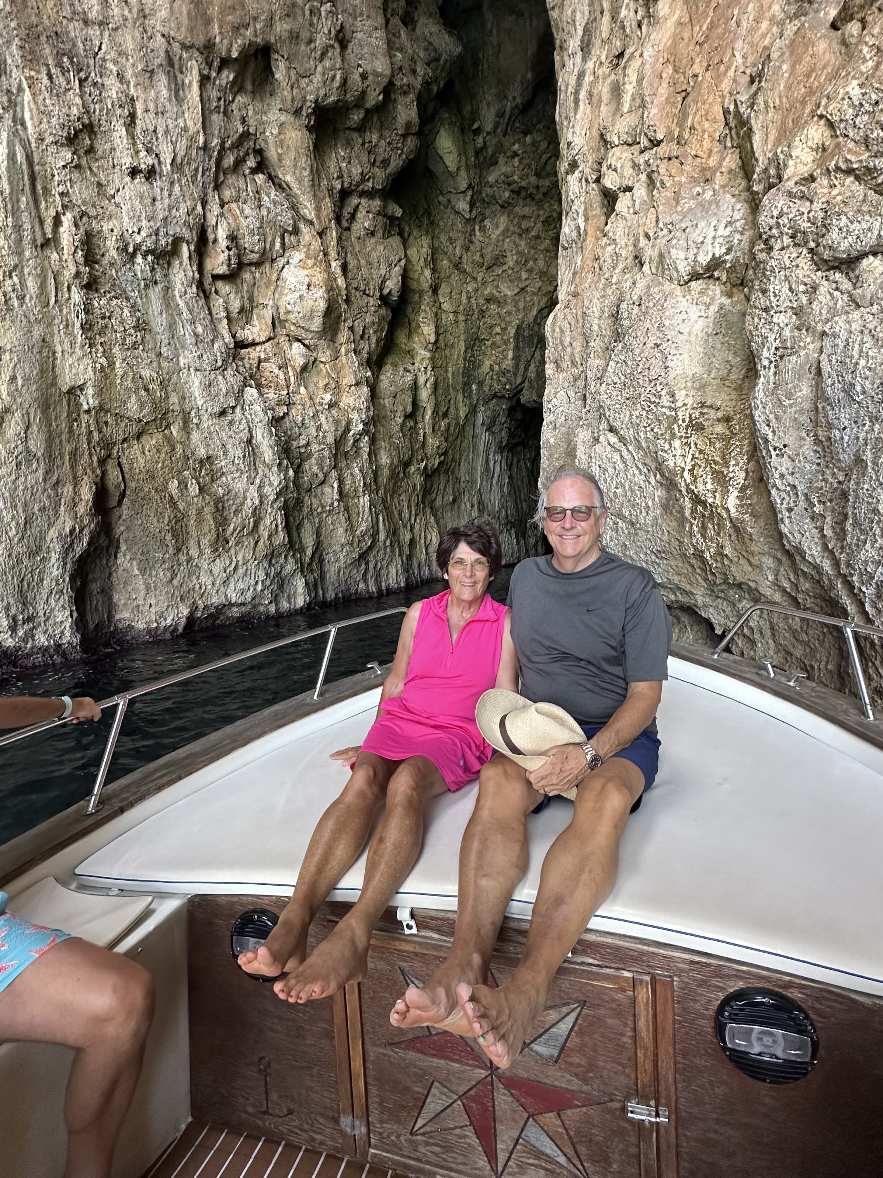 From the church we wandered around the small, narrow streets enjoying the views of town and the Adriatic See. Before getting on a boat to see caves, Mark had another cappuccino . I was concerned that the water would be rough, as it had been the other day, but the Sea was only slightly choppy. We, however had no interest in swimming. The caves were larger and easier to enter and experience than the last trip, which was nice. The rocks were colorful, there were lots of shells and it was fun to see the town hanging on the edge of the cliffs. The tiny, rocky beach was full of people enjoying themselves, but it did not occur to us to join them.